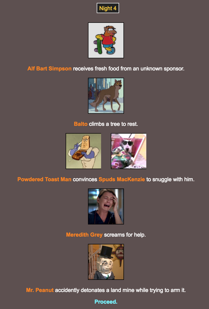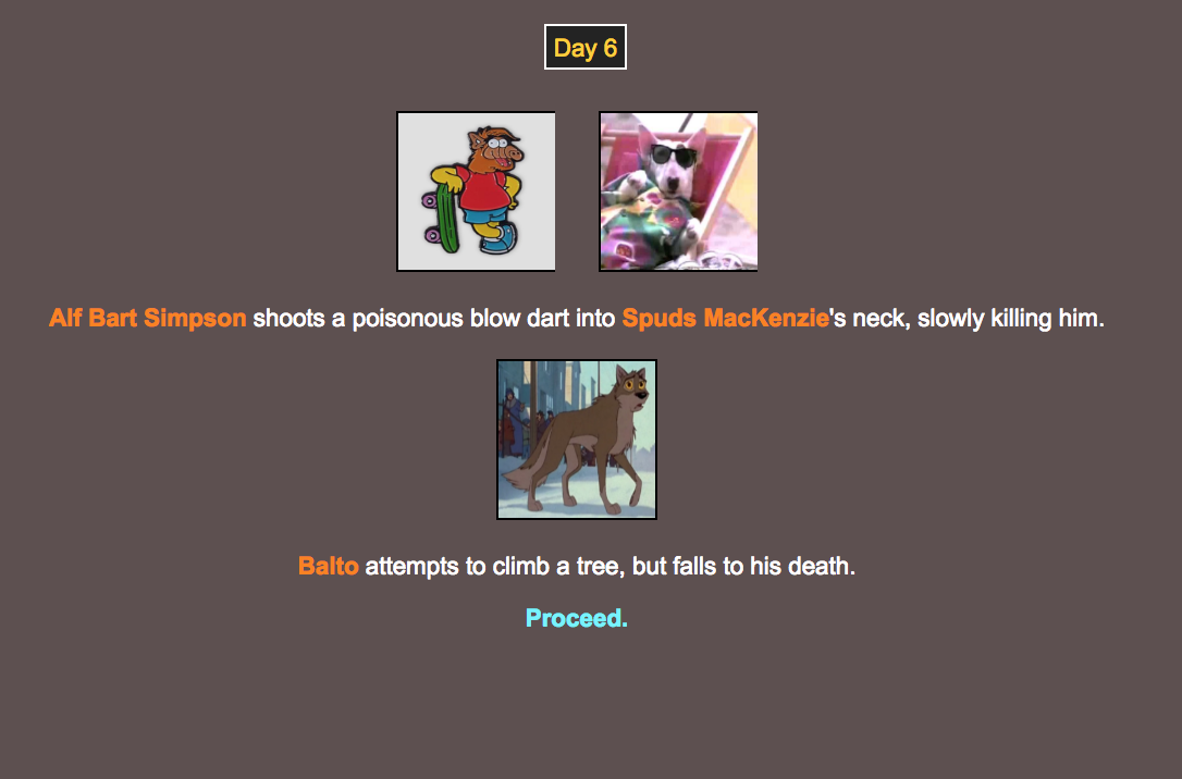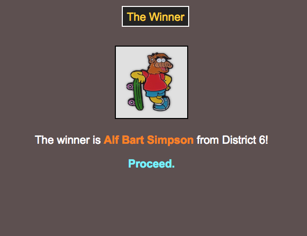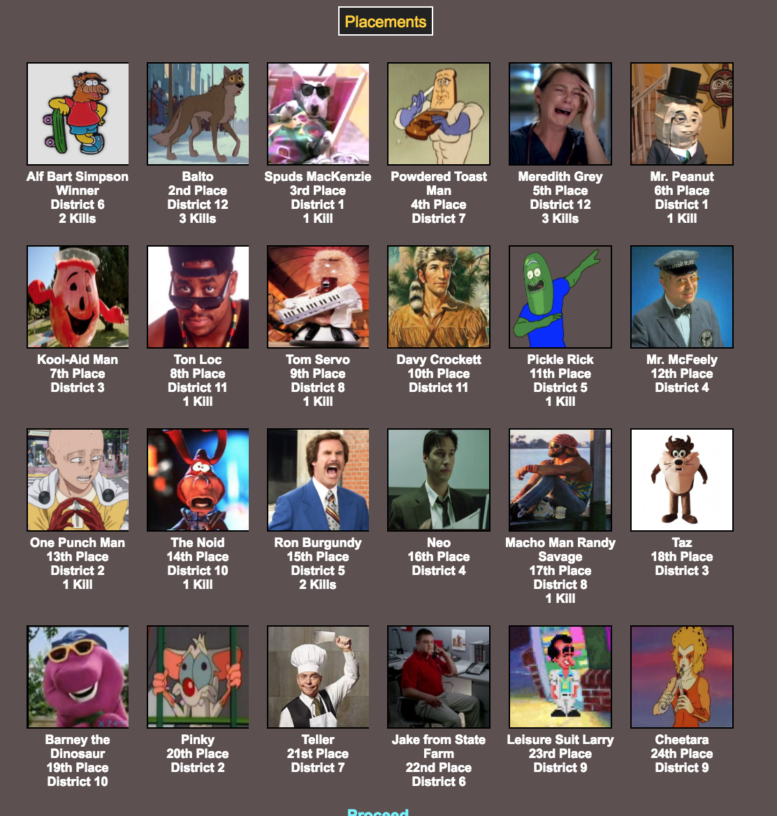 I’m not sure why District 6 (Alf Bart and Jake From State Farm) gets first place; Sure, Alf Bart was the only survivor, but Jake died on Day 1 and District 12 (Meredith Grey and Balto) got a third of all the kills! District 12 got robbed. They should protest or something.