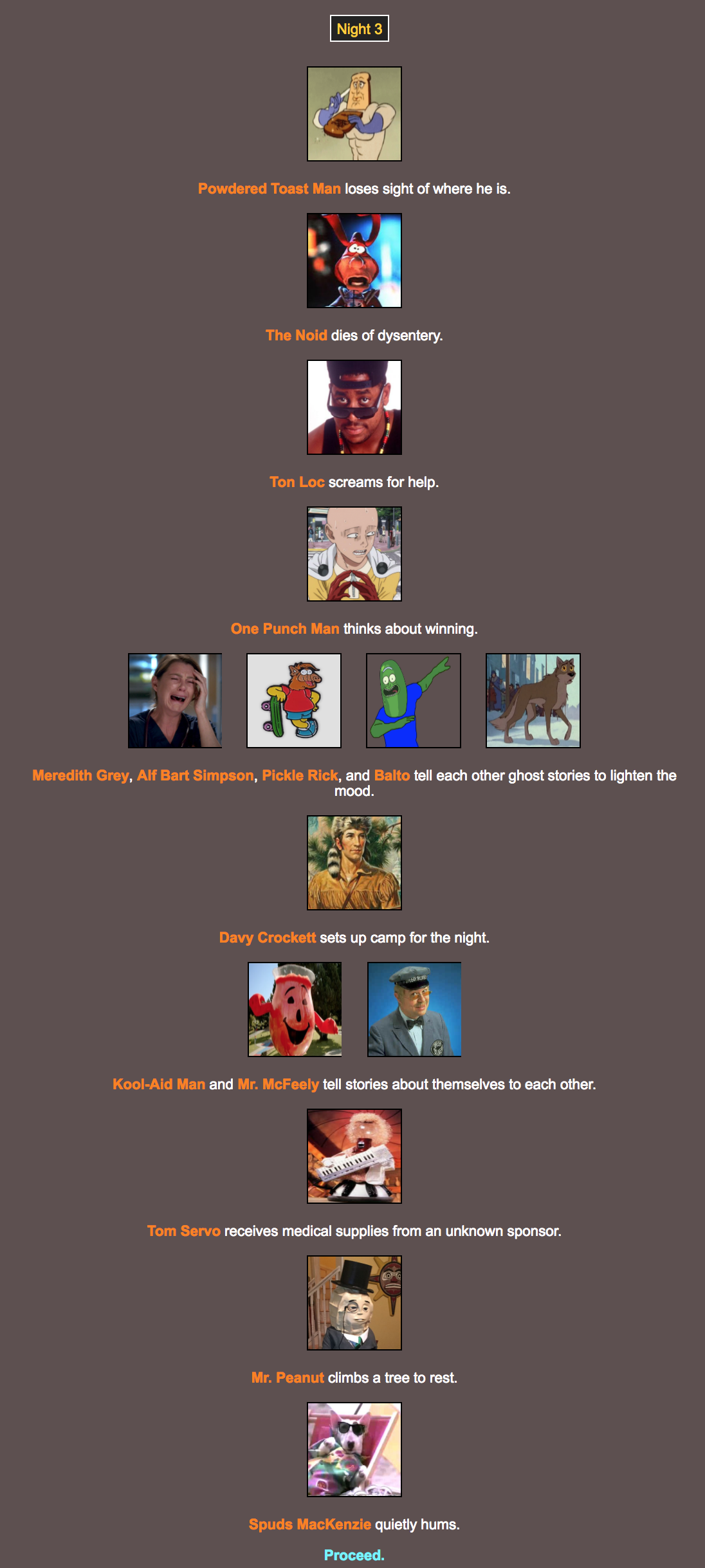 then i ran through the whole simulation myself to make sure it would turn out fun – the first time 9 people died the first day, so i went back and changed something so i’d get a new simulation. i took all the screenshots at this time and numbered them.