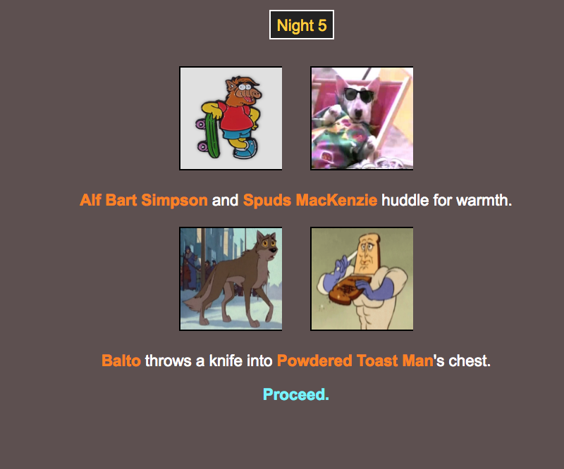 anyway, yeah, it worked out really well. i assigned random nicknames to everyone (some elected to change theirs). i think if i hadn’t done that people would not have been as interested. my random nickname was “Ace”. the guy that survived was “Skipper”. strangely, “Butcher” and “Killer” didn’t last very long. i used this generator