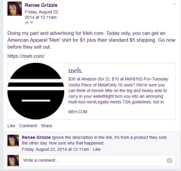 Seeings how "meh" is not immediately associated with meh.com in most folks' minds, it would have been better advertising to put "meh.com" on the shirts. They see a shirt with meh.com on it and they'll want to see what it's about. They see a shirt with just meh on it and they'll think it's just a shirt about indifference or a Simpsons reference or something. Could have put a small ".com" after the big "meh" logo. Just sayin'.