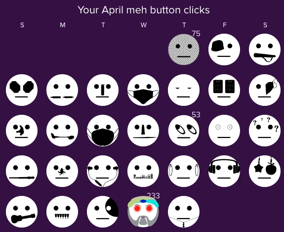 13Since the Meh button is the same image every time today, I think it would have been funny if every time we clicked it today, the beard grew longer, so by the end of the day the beard was running down the side of the display on my phone. Seriously hanging out here all day really tanks my ability to focus on more important things in my life.
