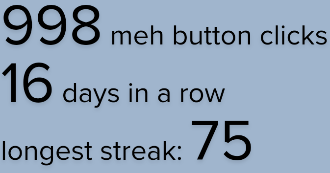 @lisaviolet and @ruouttaurmind The two of you are way more dedicated to clicking every day than I have been (although I think the meh click face bot ate some clicks in the past - likely I didn’t realize that I wasn’t logged in when I clicked) LOL