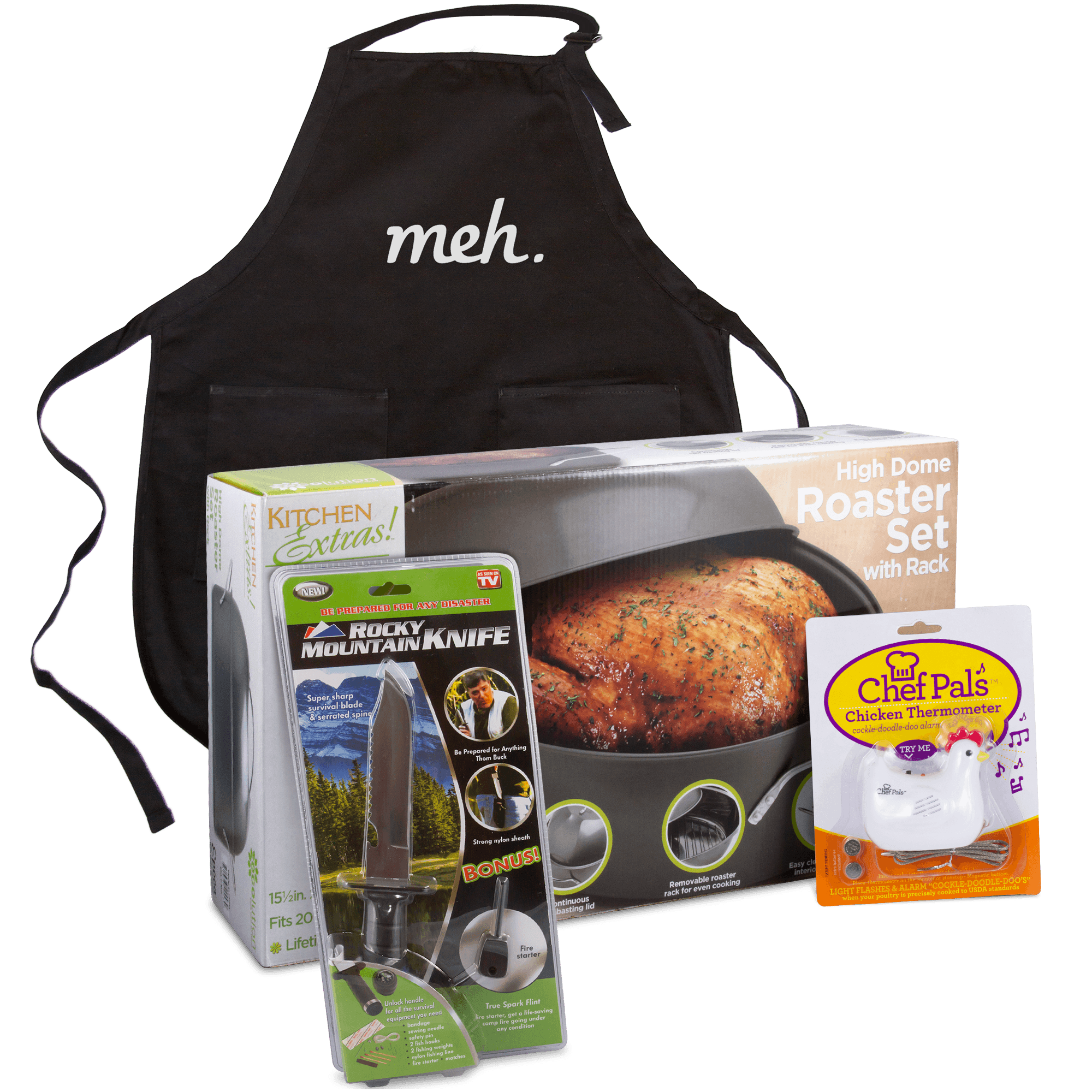 Specs====####Ecolution Roaster- Model: EKLT-1611- Continuous self-basting lid- Removable rack- Holds up to 24lb turkey- Riveted metal handles for added strength- Ecologically advanced water based non-stick coating is PFOA free- Dishwasher safe- Oven safe up to 450 degrees####Thermometer - Model: ET447/ET491- You either get a chicken or a turkey thermometer- Alarm gobbles or clucks with flashing lights when poultry reaches USDA standard temperature- Includes 4x L1154F batteries- Probe goes in bird, thermometer stays on counter- Magnetic bottom- No warranty####Meh Apron- Black with Meh logo- Two pockets on front- Stain-release technology####Rocky Mountain Knife - RMK-MC12- Versatile tool set and durable construction - Super sharp survival blade and serrated spine - Emergency Preparedness Kit stored in the handle - Includes: Knife, sharpener, compass, fishing gear, flint, matches, whistle, & more Condition - NewWarranty - Lifetime Epoca (Roaster Pan), 90 Day Mediocre for everything elseShips Via - FedEx SmartPost- $5 Shipping, Free with **VMP**What’s in the Box?====1x Roaster pan with lid and rack1x Turkey or chicken thermometer1x Meh apron1x Rocky Mountain knifePictures====Bundle with turkeyBundle with chickenKnifeRoasterChicken thermometerTurkey thermometerMeh ApronChickenPrice Check====$39.00 at Amazon (Roaster)$5.75 on Amazon (Thermometer)$14.99 at Rocky Mountain Knife$10 at Mediocre (Apron)