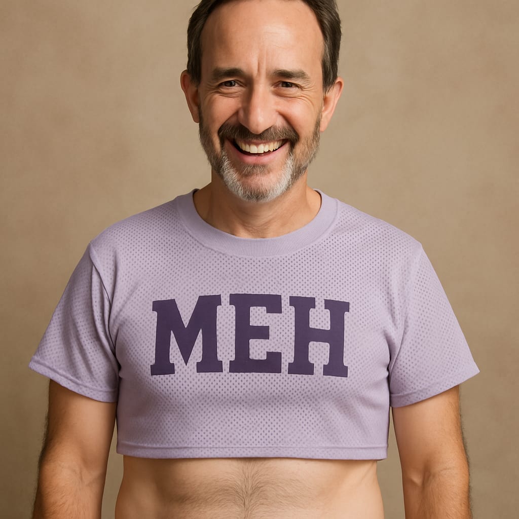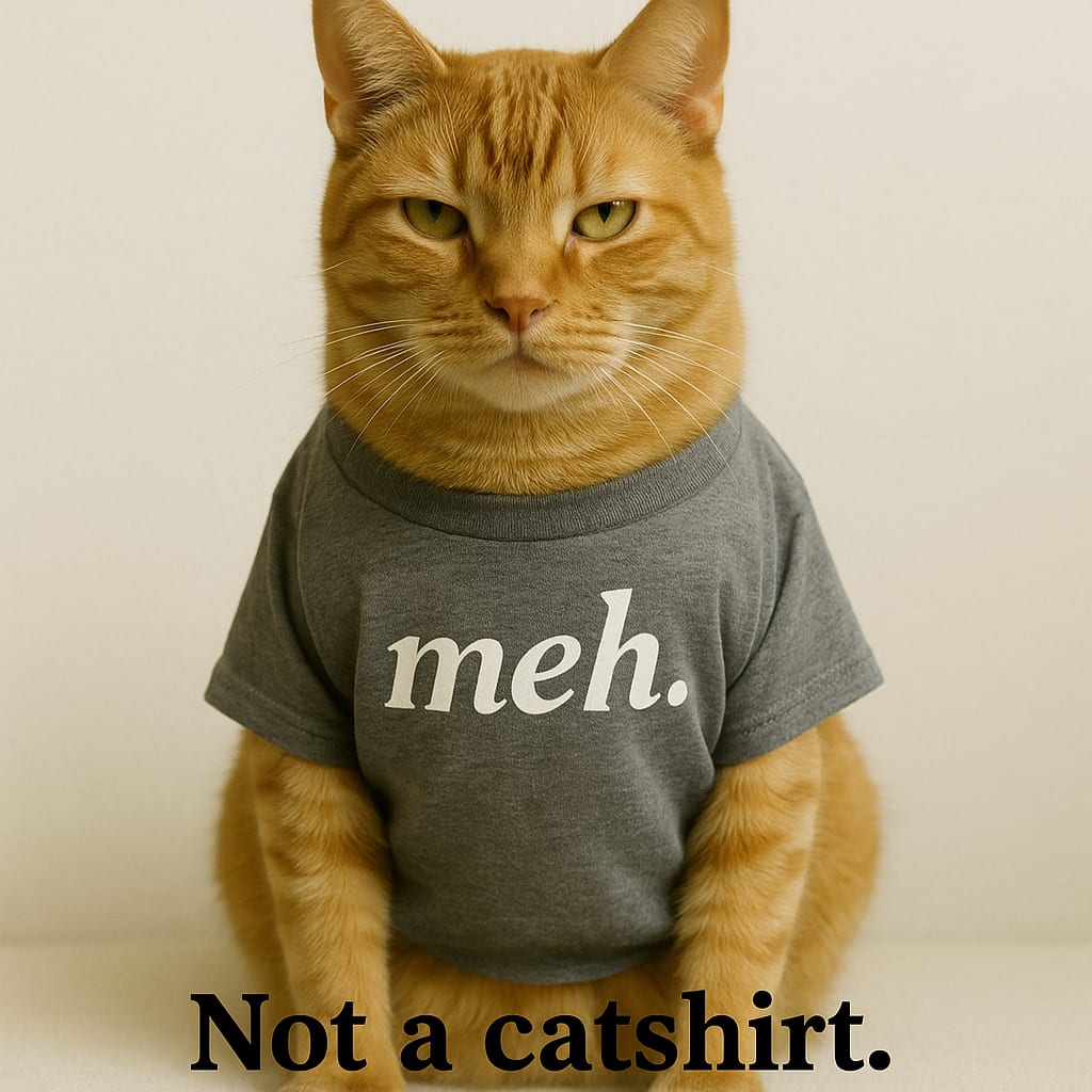 /showme a cat wearing a shirt that says “meh” in italics with a caption below the picture “Not a catshirt.”