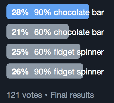 @dave Why does your twitter poll have chocolate listed twice and fidget spinner listed twice? I noticed one says 90% and the other 60% but have no idea why. I can almost understand a bar having 90% chocolate or 60% chocolate but how can you have a 60% fidget spinner?