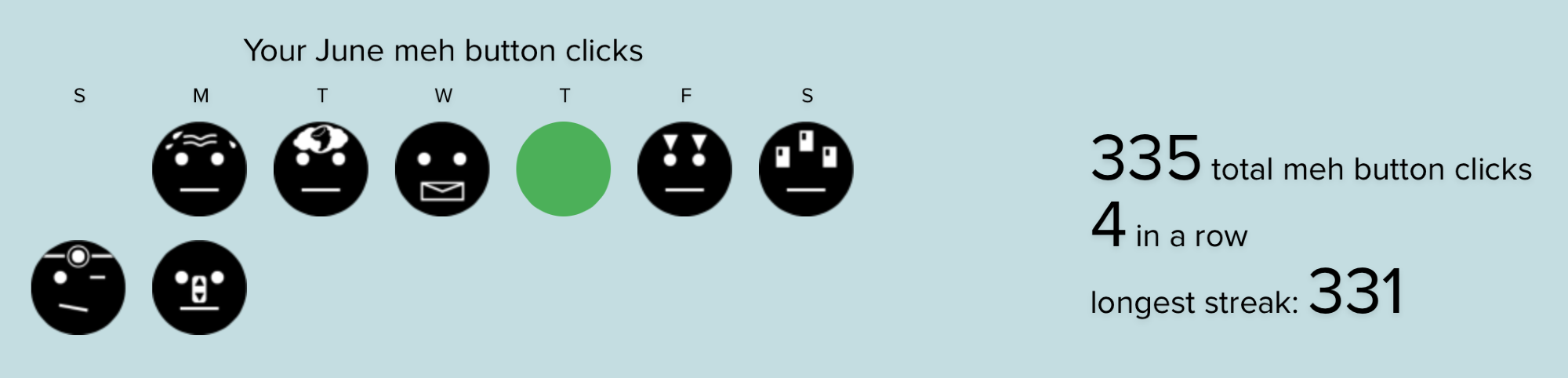 I have a different kind of perfect streak. I wanted to make sure I would never feel the pressure to click or remorse of missing a day of clicking the Meh button, so: