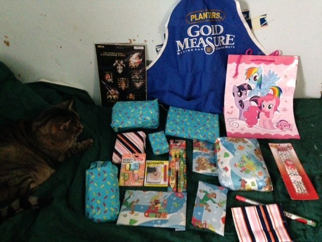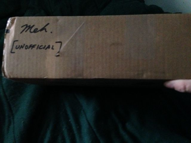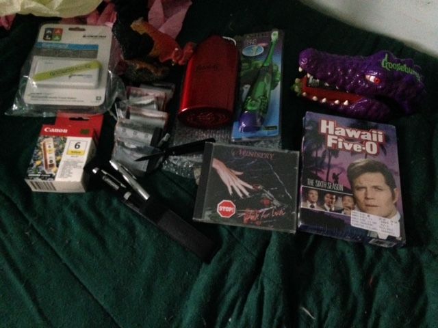So cool! Here's what was in the box: 2 Mythbusters talking bobble heads, a Zombrex medication injector and prescription pad, an Intel gaming t-shirt with expired competition entry instructions, a Southpark ornament, a Santa punchball, a bag of Tim Horton coffee, Bones DVD season 1, CSI DVD season 3, two Terry Pratchett paperbacks, a speaker dock and just in case I didn't have a compatible phone, a phone. And a lovely note. Thanks, @nikodemus!!!You completely made my otherwise meh day! I took a picture but have no idea how to upload it.
