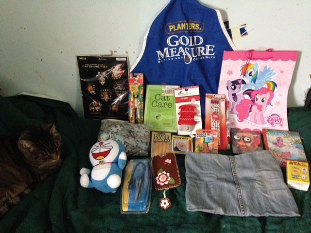 Groot bobble head, Hello Kitty 8GB mimobot flash drive, Hello Kitty pencil with big Hello Kitty eraser, PBnJ spreader, Shark Creature Cup, 180's ear warmers, Solar grasshoppers (three), Megaman mini helmet replica with display stand, 100 water balloons, Iron Man novelty bag,