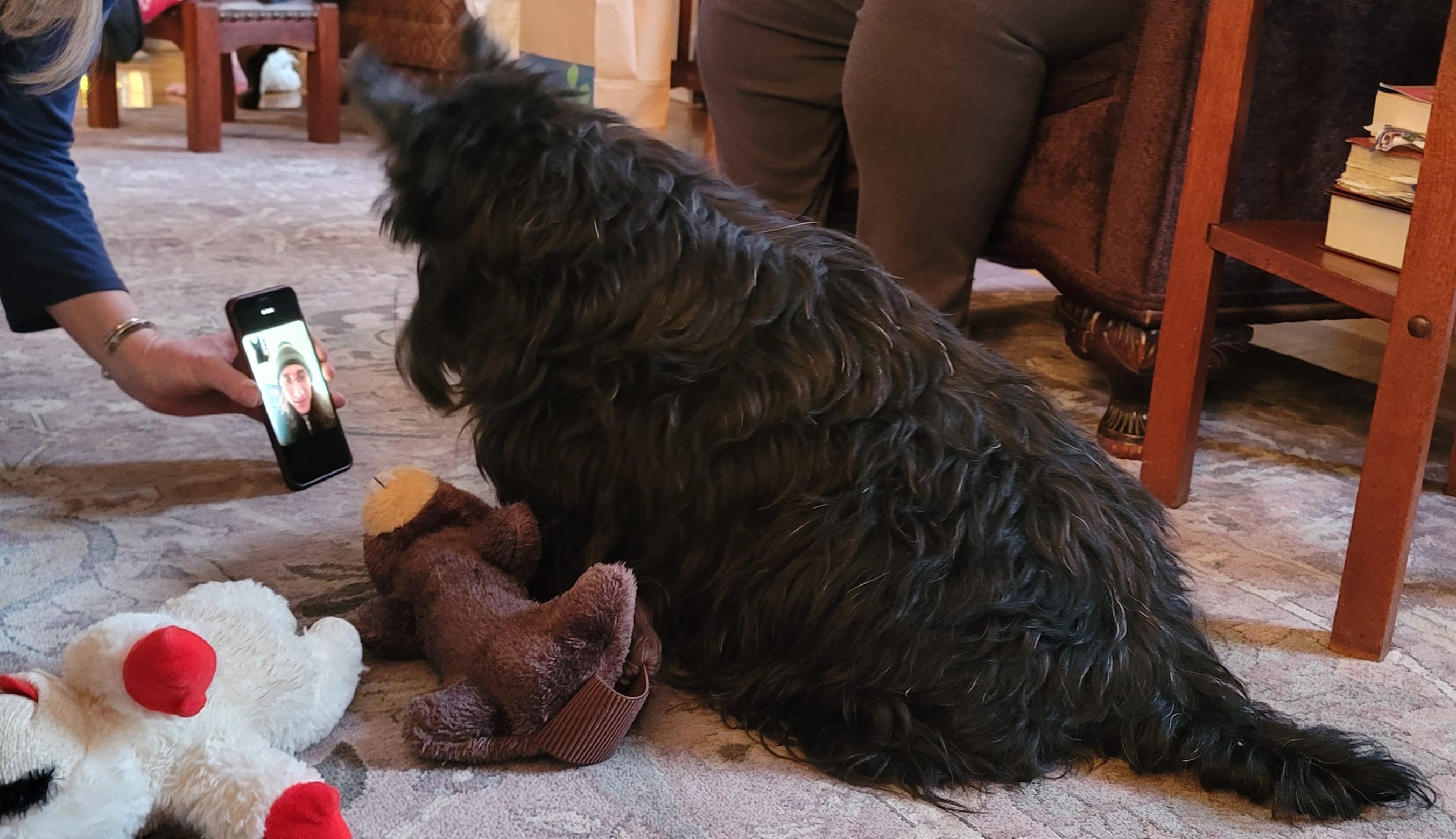 @CharlieDoggo yekoP got a new squeaky beaver. He was showing it to elkcirP on his video chat. He was very excited.