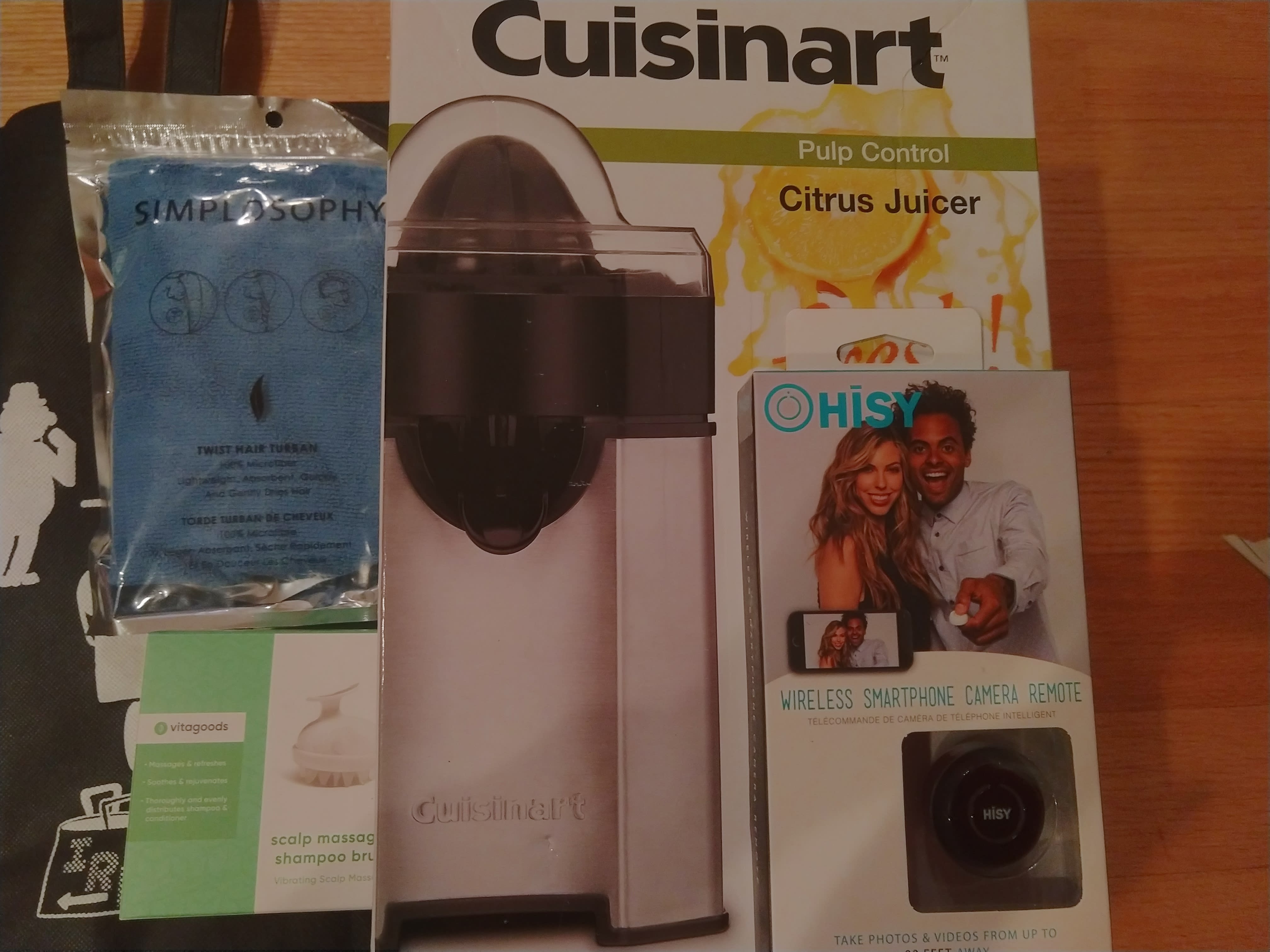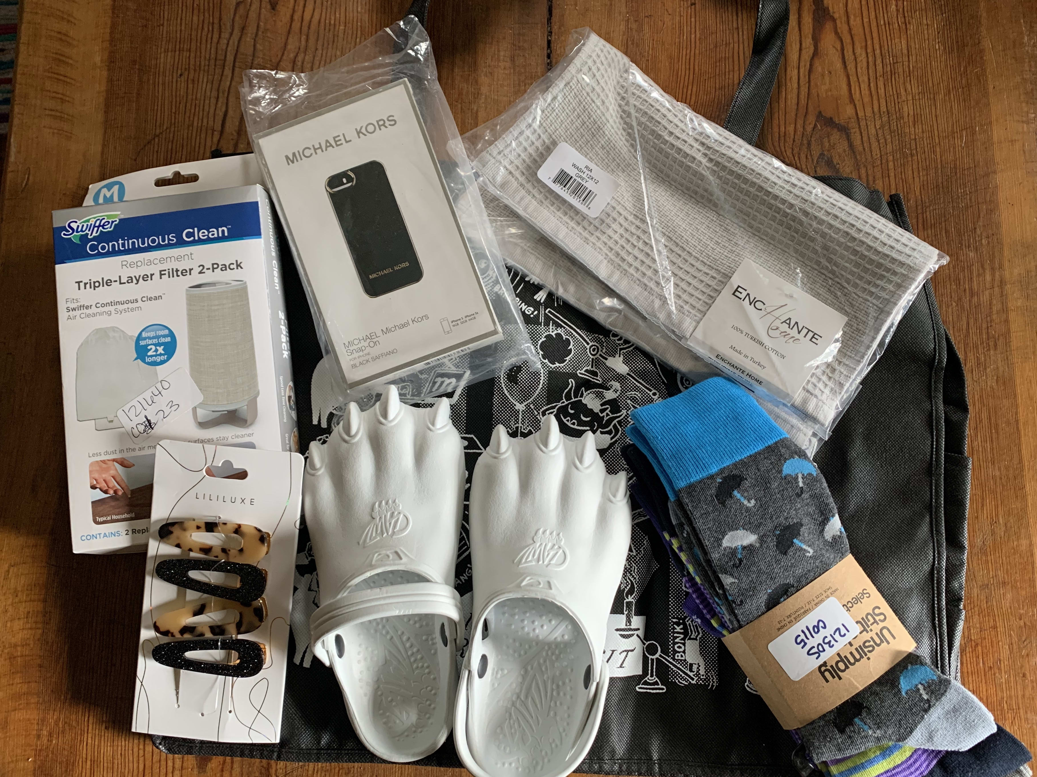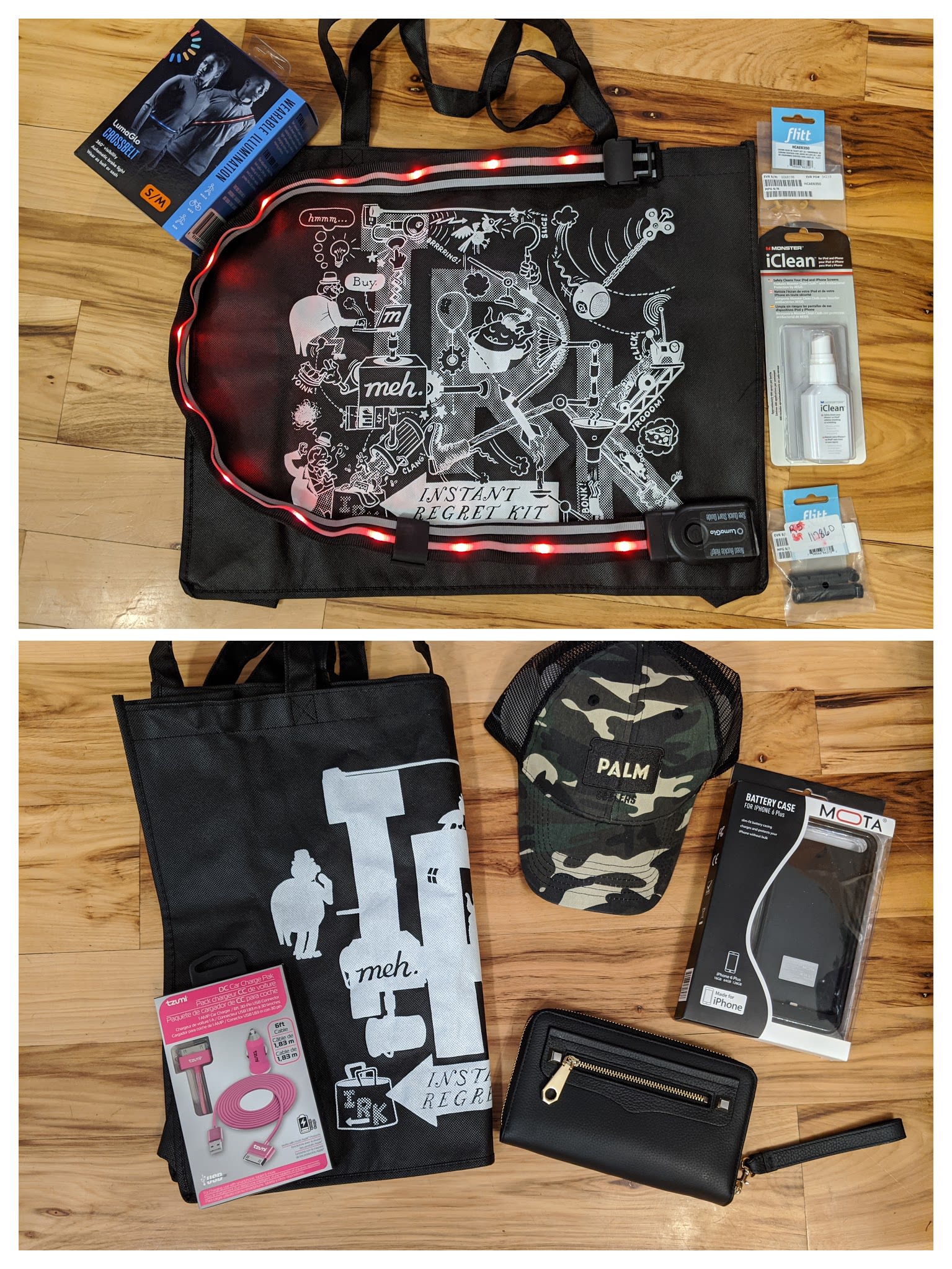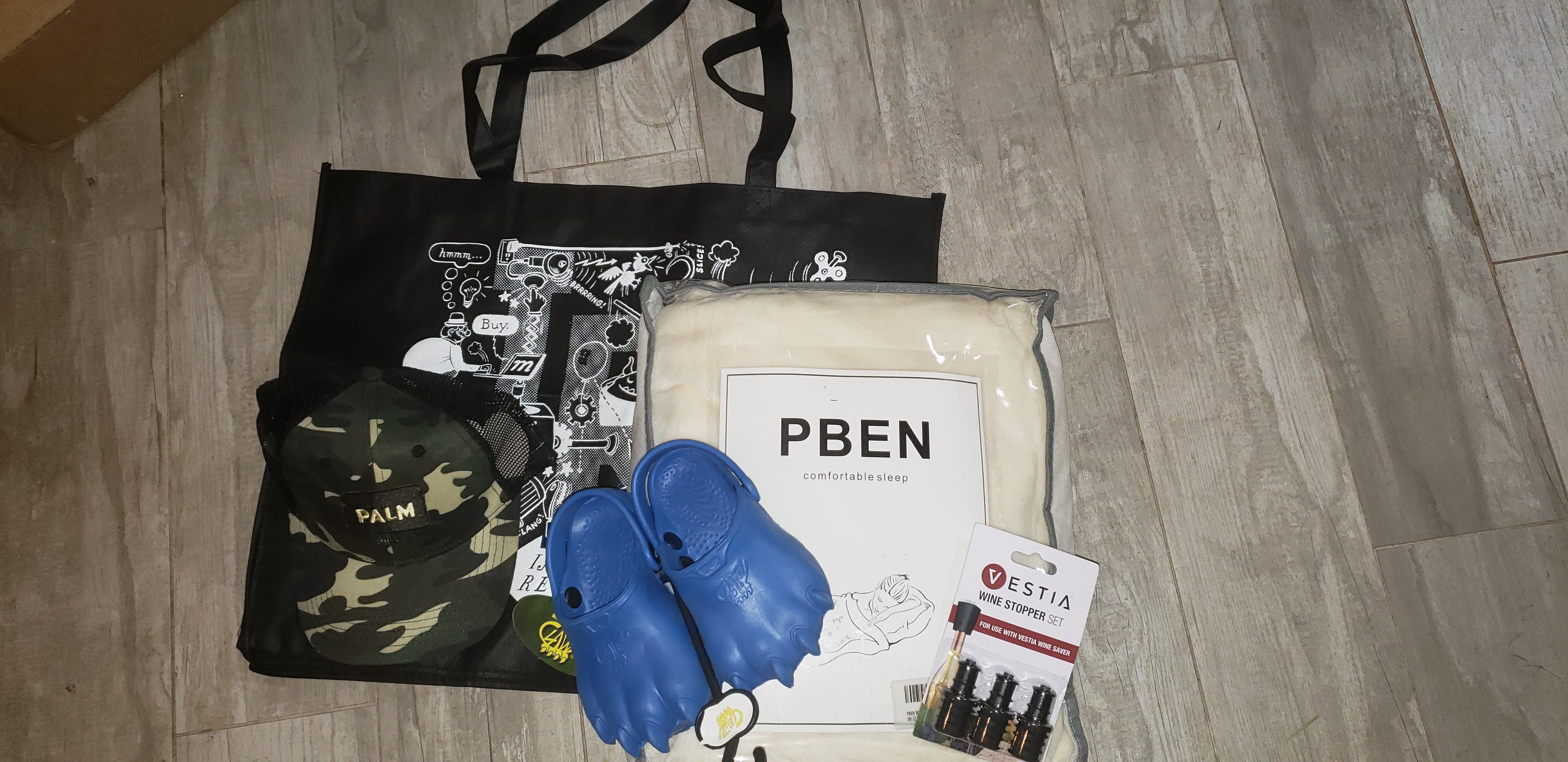 A little underwhelming. The bag is the best part. Got a pack of wine stoppers, three different cell phone cleaning kits, a clip on cell phone lens set, and some large padded thing with an adhesive backing and the word “palm” on it. No clue on what that is.