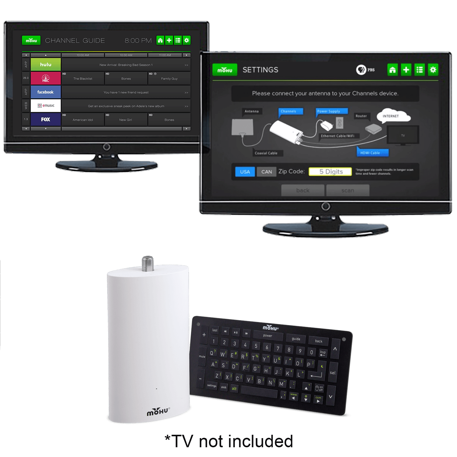 Specs ====- Model: MH-CHBOX01 - See all of your TV content in one channel guide- Internet connection: Wifi or ethernet- RF Remote control with QWERTY keyboard and IR blaster for controlling your tv set- Audio/video: Dolby 2.1, 5.1- Local HD TV requires TV antenna (not included)- Pause, rewind, and fast forward up to 30 minutes of live tv- Plug in a USB storage device to play personal content- Built-in web browser- Download streaming apps like Netflix, Hulu, and SlingTV as well as other apps, games, and movies from the Google Play store- Power: AC100-240V for Mohu device, 4x AAA batteries for remote (included)- Manufacturer info pageCondition: NewWarranty:90 Day MehEstimated Delivery: 12/14 - 12/17Shipping: $5 or free with **VMP**What’s in the Box?====1x Mohu device1x Keyboard remote control 4x AAA batteries 1x HDMI cable 1x Power adapterPictures ====The productEverything includedGuide and setup menuPortsKeyboardBuy stuff from Meh on your MohuPrice Comparison====$99 List$89 for Kickstarter backersFind a relevant price comparison? Please share it in a comment in this thread