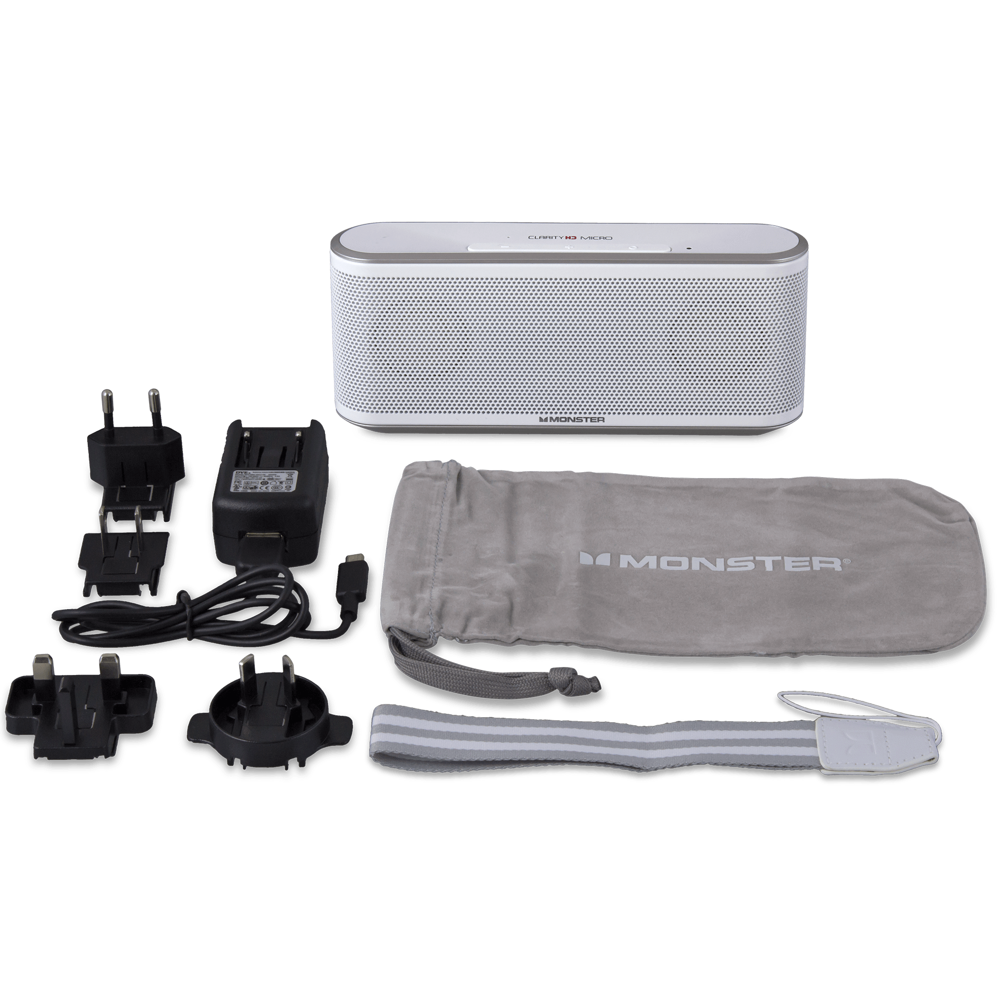 Specs====- Model: MBL CLY MICRO WH WW- Alternate part number: 133267-00- Bluetooth: 2.0- 3.5mm aux in port- Speakerphone ability with built-in mic and call controls- On-board controls: play/pause, volume up, volume down, skip track, previous track, disconnect bluetooth, answer call & pause music, reject call, hang up & resume music, toggle call between mobile device and speaker, answer call waiting & put original call on hold, mute microphone, unmute microphone, increase volume & unmute volume- Voice commands: 24 (really more like 20 because they count “cancel” a bunch of times)- Dimensions: 7.25 x 3.25 x 1.5 inches- Two internal speakers: 8ohm 3W each- Internal battery: 3.7V/2100mAh- Removable grills with other colors sold separately - Manual PDFCondition: NewWarranty: 1 Year Monster (page 15)Estimated Delivery: 2/23 - 2/25Shipping: $5 or free with VMP What’s in the Box?====1x Speaker1x Travel bag1x Lanyard1x USB to Micro USB cable1x USB power adapter4x International power outlet adapters Pictures ====Hand for scaleFancy retail boxFront viewEverything includedBluetooth connectionThe speakers under the removable grillPrice Comparison====$229.95 List, $61.74 at Amazon (white grill only)Alternative colored grills for sale on AmazonReview Highlights - “If you can get it for less than $125, it’s definitely worth considering.” - CNET - (RE: Misleading Amazon sale for alternate grill covers) “was the wrong item but was great” - Supertech Find a relevant price comparison? Please share it in a comment in this thread