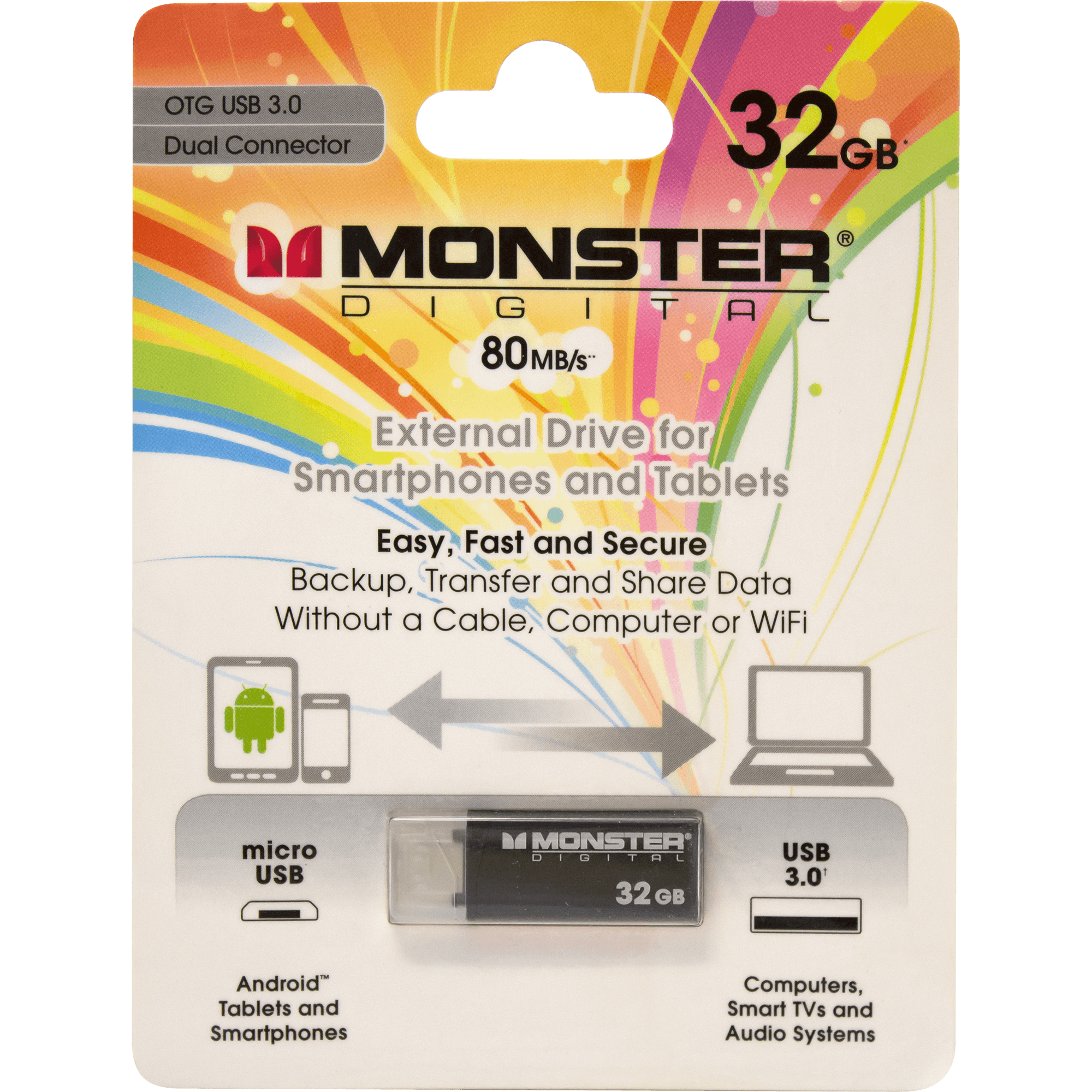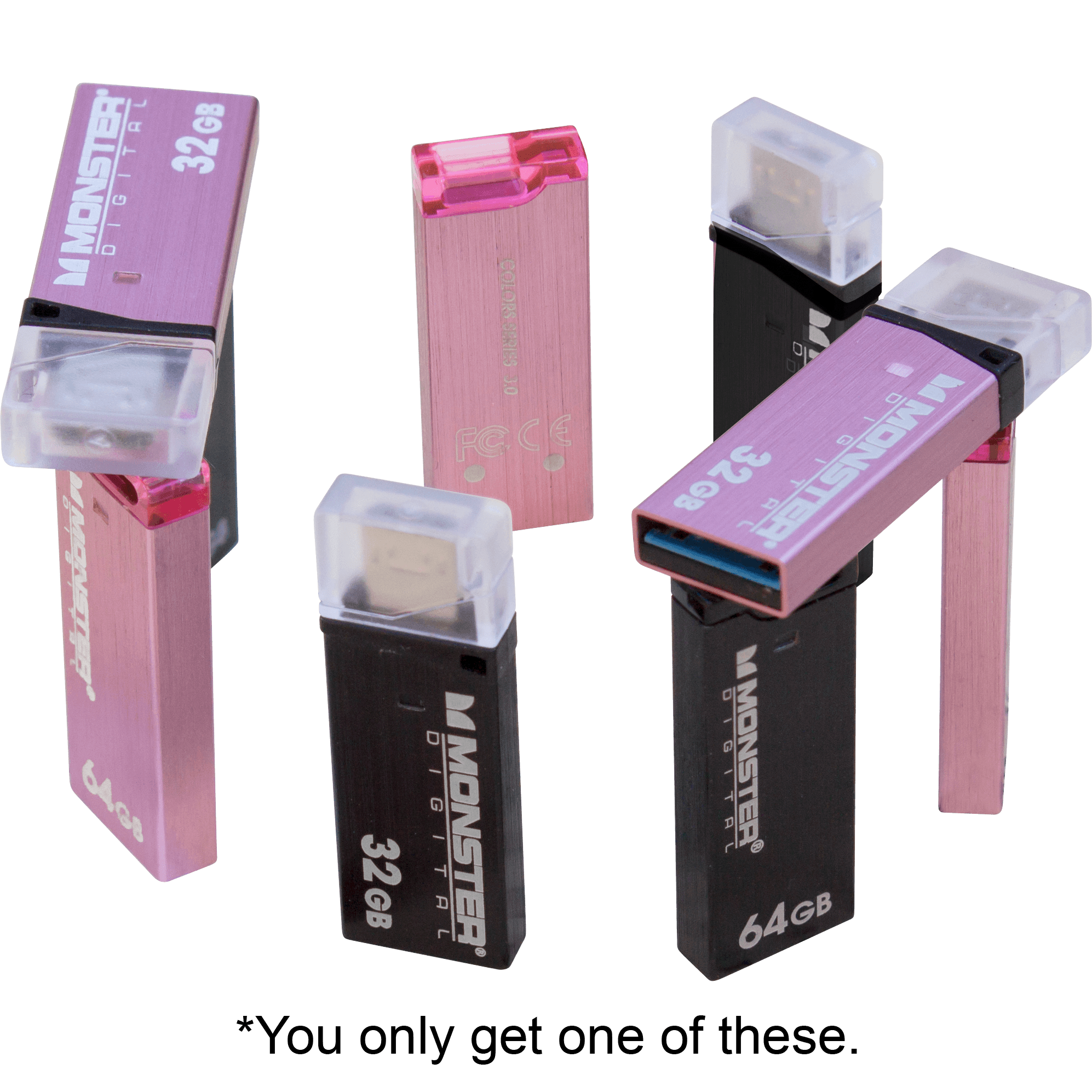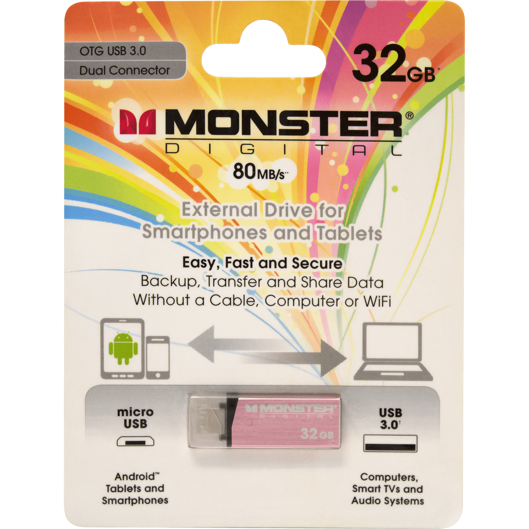Specs ====32GB:- Model: USBOM-0032- Size: 32gb- OTG- Read speed: up to 80MB/s- Transfer data from smartphones and tablets via Micro USB- Transfer data from computers via USB 3.0- Metal case with protective plastic cap64GB:- Model: USBCL-0064- Size: 64gb- Read speed: up to 80MB/s- Transfer data from computers via USB 3.0- Metal case with lanyard loopCondition: New (with blemished packaging)Warranty: Lifetime Monster DigitalEstimated Delivery: 9/22 - 9/24Shipping: $5 or free with **VMP**What’s in the Box?====1x USB 3.0 drivePictures ====OptionsScale64gb black packaging64gb black64gb pink packaging64gb pink32gb black packaging32gb black32gb pink packaging32gb pinkDrive HengePrice Comparison====$30.94 List, $19.99 at Amazon for 32GB $44.99 List, $24.99 at Amazon for 64GBFind a relevant price comparison? Please share it in a comment in this thread