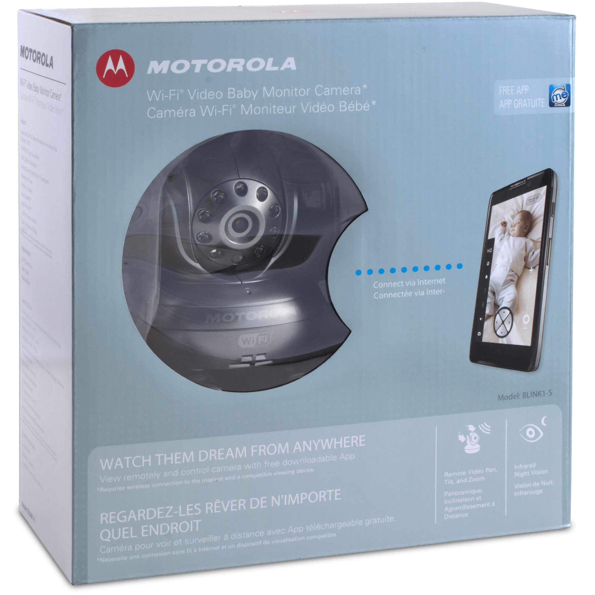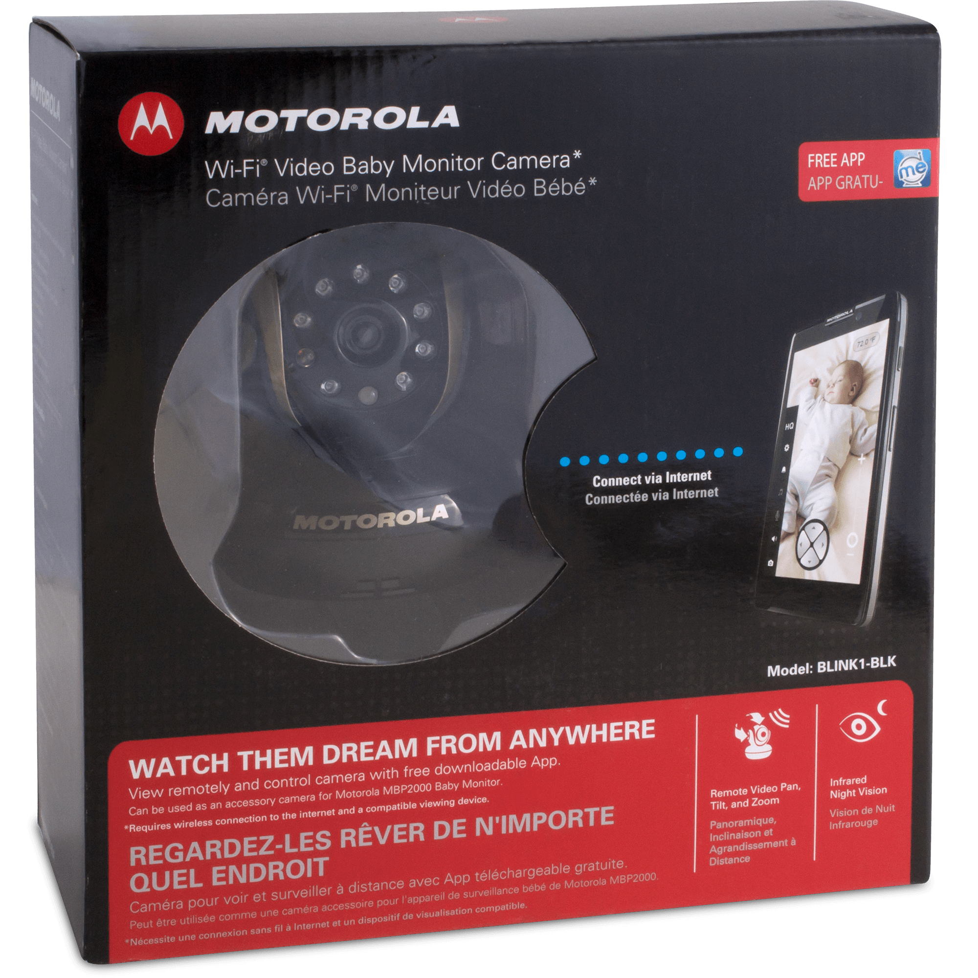 Specs====- Model: BLINK1-BLK- Model: BLINK1-S - Access via secure app on Android or iOS- Wi-Fi 802.11 b/g/n connectivity- MJPEG compression- Remote camera control to pan, tilt, and zoom- Infrared night vision- Polyphonic lullabies- Image snapshot (Android only)- Video recording (Android only)- Two-way communication- Room temperature display- Image sensor: Color CMOS- Lens: f 2.6mm, F=2.8- IR LEDs: 8- Power: 100-240 VAC, 50/60 Hz, 0.3ACondition: NewWarranty: 1 Year MotorolaEstimated Delivery: 2/16 - 2/19Shipping: $5 or free with VMP What’s in the Box?====1x Motorola WiFi Camera1x User guide1x Power adapterPictures====Retail box blackEverything in the box blackRetail box silverEverything in box silverBack of the unitOr buy two and do the painting gag from Scooby DooInset image from Virtualwolfe used under Creative Commons LicensePrice Check====$199.99 List, $109.69 for Silver at Amazon$169.99 List, $103.47 for Black at Amazon