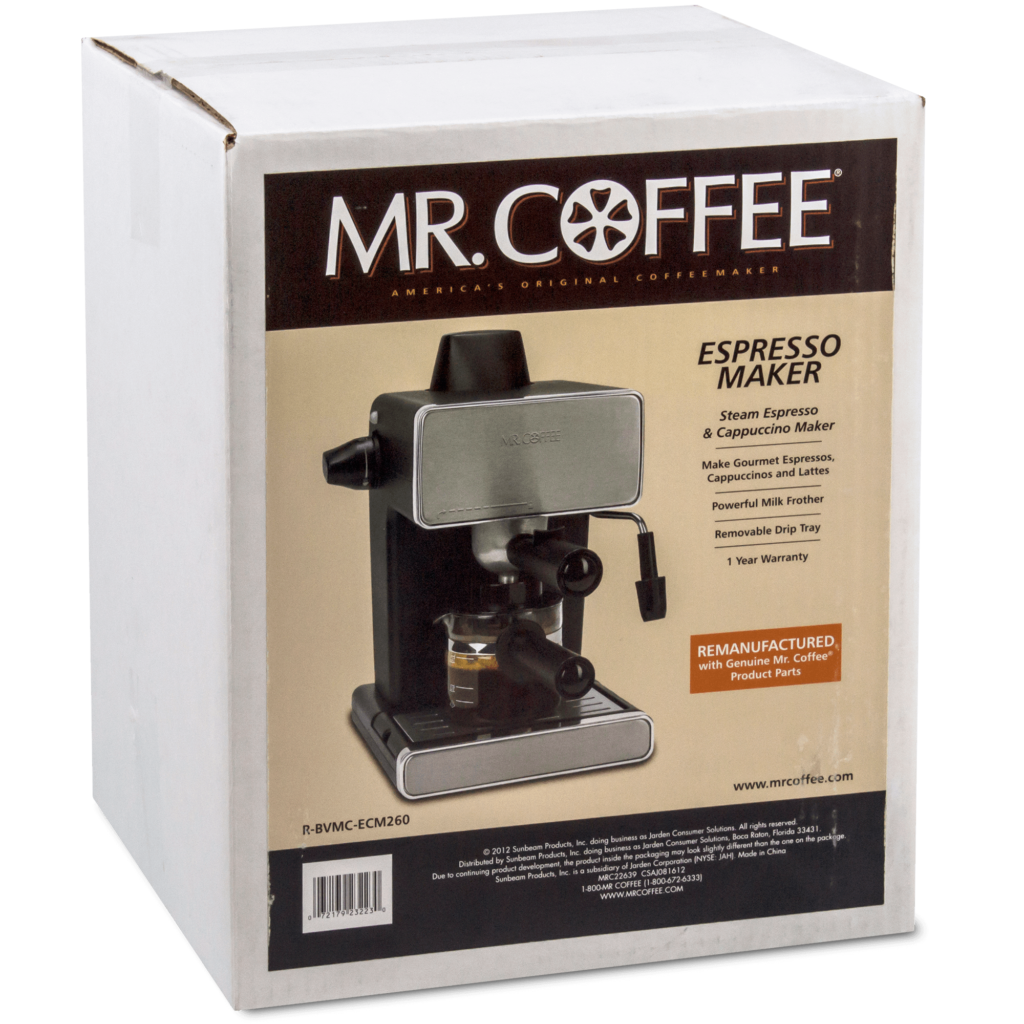 Specs ==== - Model: BVMC-ECM260 - Capacity: 20oz - Milk frother for cappuccinos and lattes - Glass decanter with printed measurements, drip-free spout, and handle - Removable drip tray - Dimensions: 10.25" x 9.75", 13.25" - Power: 900W 120VAC 60Hz - User manual .PDF Condition: Refurbished Warranty: 1 Year Sunbeam Estimated Delivery: 10/14 - 10/16Shipping: $5 or free with VMP What’s in the Box? ==== 1x Mr. Coffee Espresso machine 1x Glass decanter 1x Scoop 1x User manual Pictures ==== Front view Included Side view Retail box Price Comparison ==== $47.97 (New) at Amazon Find a relevant price comparison? Please share it in a comment in this thread