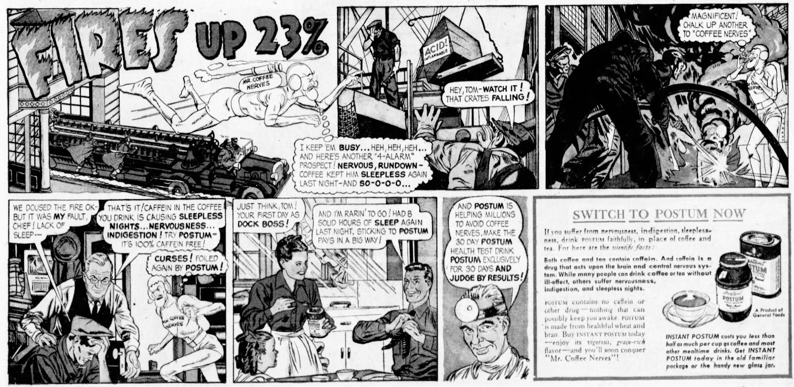 The loss of his statistics didn’t stop Mr. Coffee Nerves from continuing to stir up trouble. But he was losing his mojo as the public taste for comic-strip advertising waned. Into the early ‘50s, his adventures were reduced to single-panel composites, then as the only cartoon presence in a photographic scene. Postum was obliged to add language about how “many people can handle coffee or tea without ill-effect”, diluting the purity of Mr. Coffee Nerves’ wrath. Finally, in 1952, Mr. Coffee Nerves’ cup of spite ranneth dry.