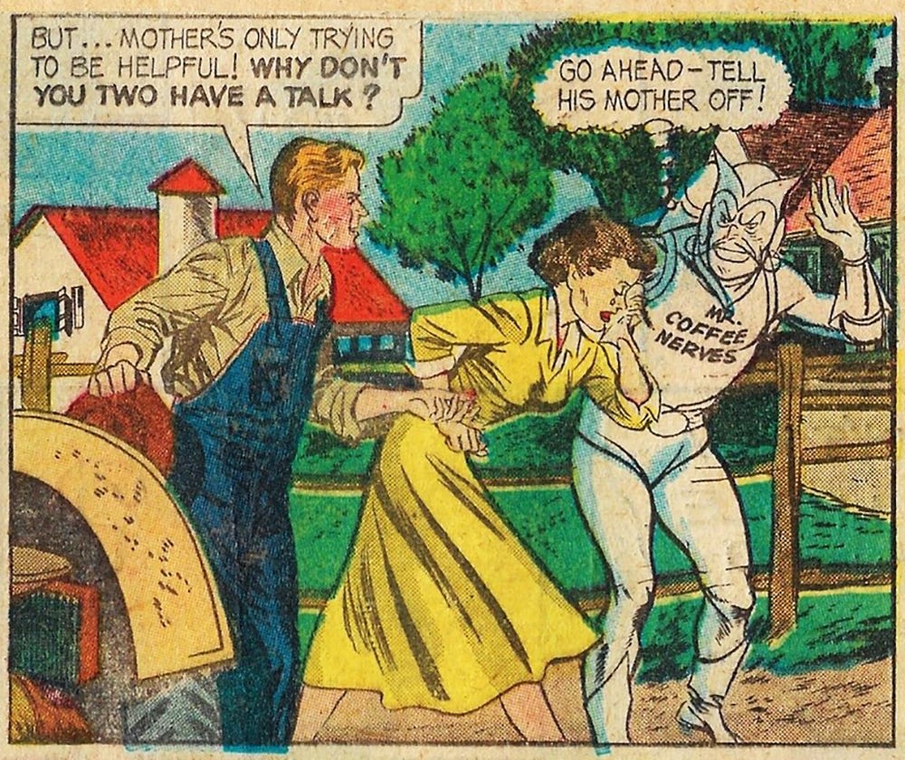 From fires to juvenile delinquency, from failed relationships to car crashes, it seems there was no social ill that didn’t bear the stain of the dread coffea arabica. Mr. Coffee Nerves’ sowing of chaos is as depraved as ever, provoking an annoyed mom to kick her rambunctious son out of the house, then encouraging the kid’s shoplifting. When a young couple argues, Mr. Coffee Nerves whispers in the man’s ear, “Nag, nag, nag! Lucky you found out before you married her!”