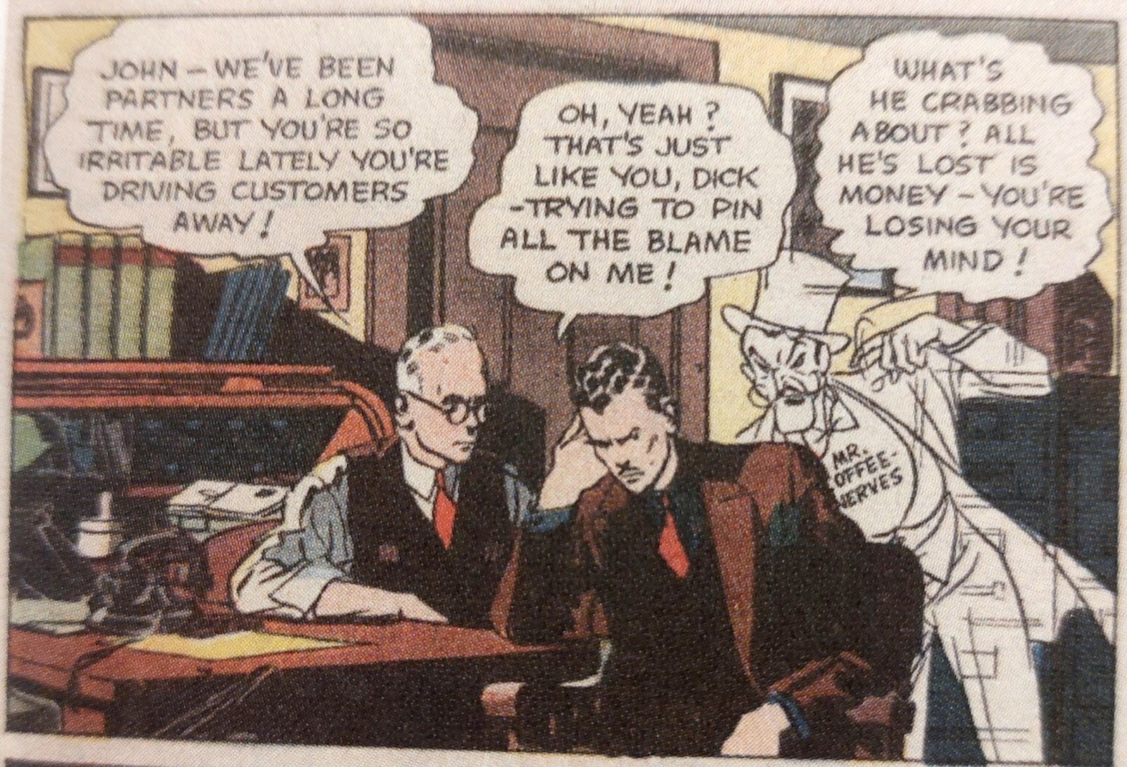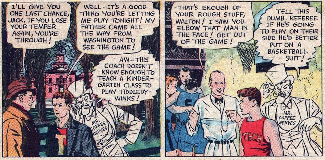 When he re-emerged in 1947, Mr. Coffee Nerves had a new look more in keeping with the atomic age, a bizarre space acrobat kind of thing that at some point also acquired what look like horns (?). He had a new artistic team, Don Komarisow and Lou Fine, both longtime veterans of comics and commercial illustration. And he had a new in-your-face approach, citing unsubstantiated statistics of societal collapse and sneeringly giving coffee the credit for every one.