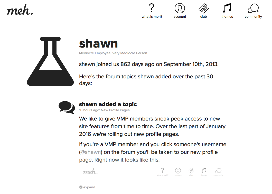 If you're a VMP member and you click someone's username (@shawn) on the forum you'll be taken to our new profile page. Right now it looks like this: