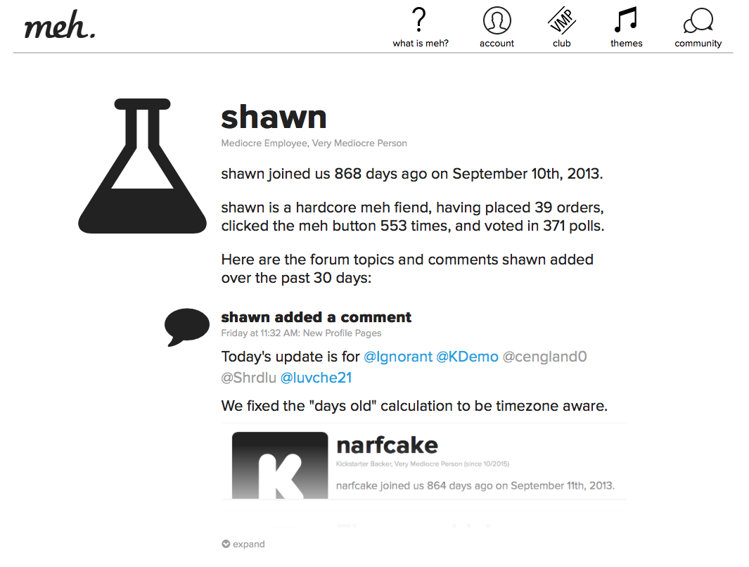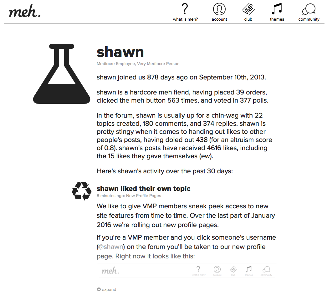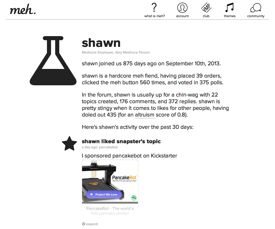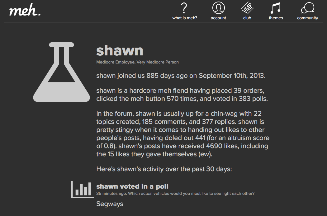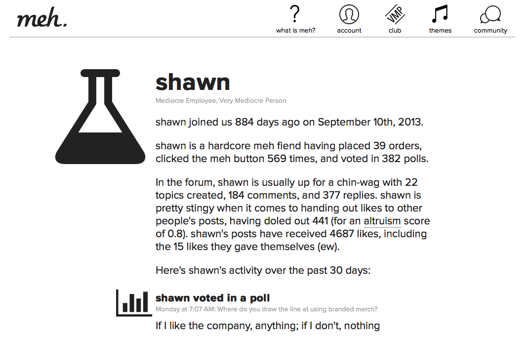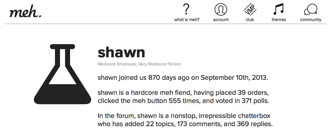Today's update adds a summary of total meh buttons clicked, orders placed, and polls voted on.