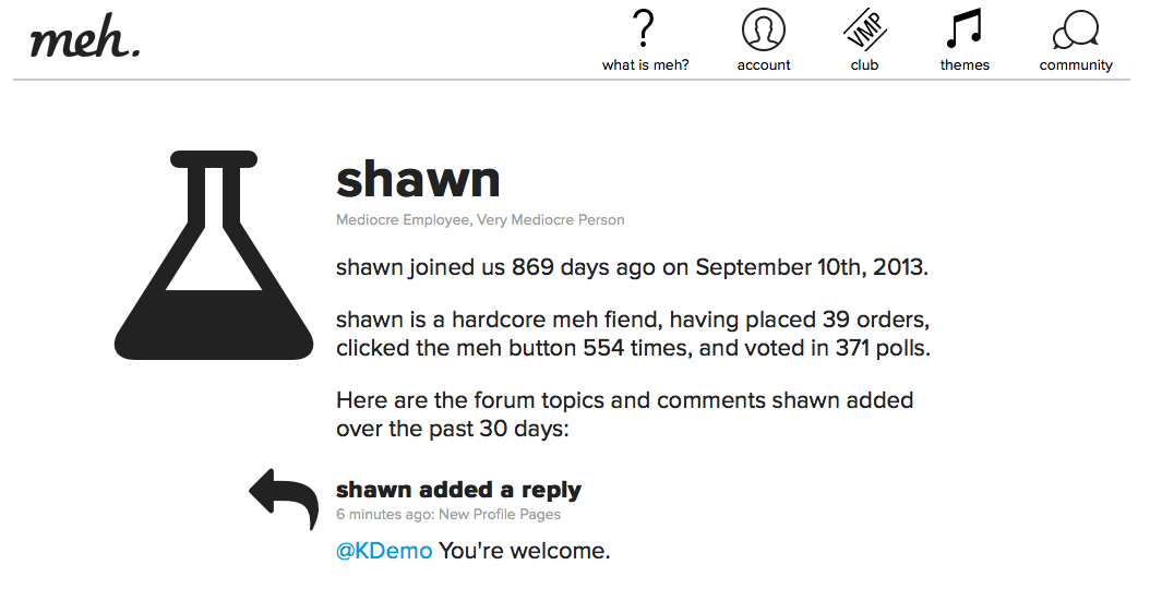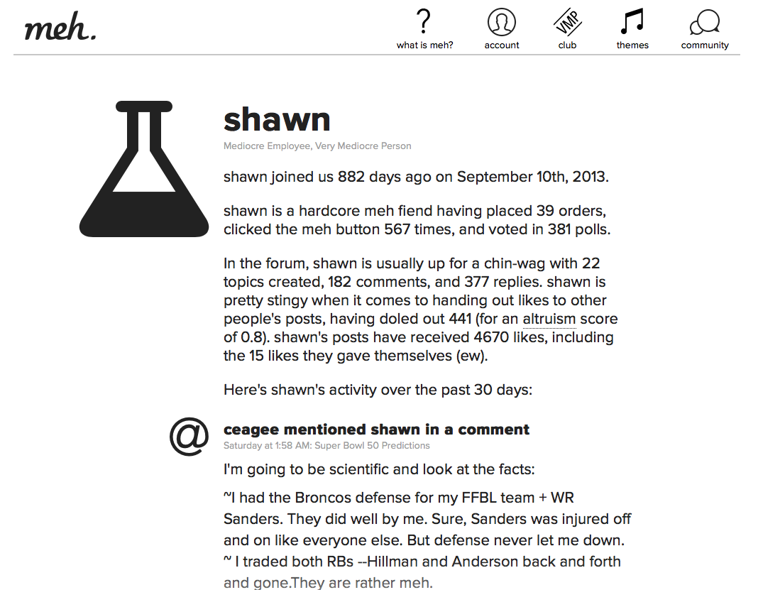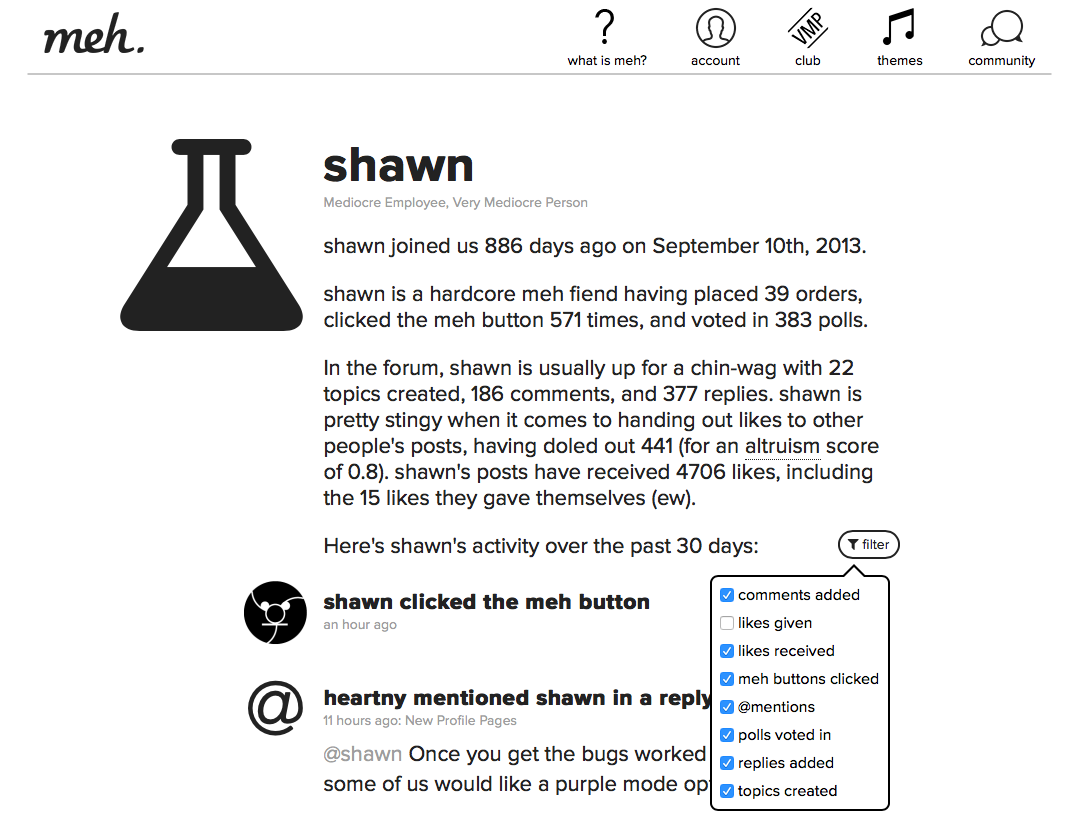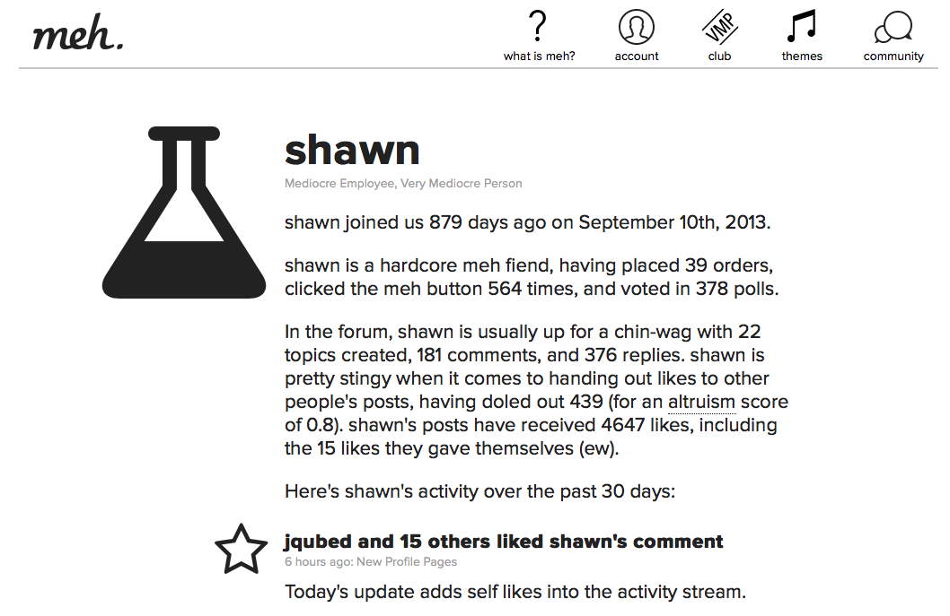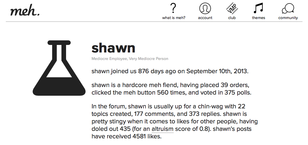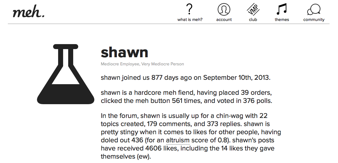 Rather than a boring list of stats we tried to make it a fun, conversational tone with flavor text like "shawn is a hardcore meh fiend" that's powered by a dumb little algorithm. Hope you dig it.
