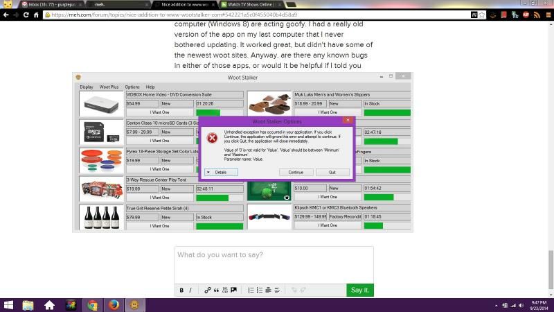 @lichme Okay, well my response above says what's happening in the android app. For Windows, a couple of the issues are as follows: 1. I constantly get the same popups, over and over, for the same items. Has happened once or twice before, before, but it's been constant during the wootoff. 2. Whenever I try to open settings, I get this error: When I click 'details', this is what it says: See the end of this message for details on invoking just-in-time (JIT) debugging instead of this dialog box. ****** Exception Text ****** System.ArgumentOutOfRangeException: Value of '0' is not valid for 'Value'. 'Value' should be between 'Minimum' and 'Maximum'. Parameter name: Value at System.Windows.Forms.NumericUpDown.set_Value(Decimal value) at WindowsApplication1.FrmOptions.FrmOptions_Load(Object sender, EventArgs e) at System.Windows.Forms.Form.OnLoad(EventArgs e) at System.Windows.Forms.Form.OnCreateControl() at System.Windows.Forms.Control.CreateControl(Boolean fIgnoreVisible) at System.Windows.Forms.Control.CreateControl() at System.Windows.Forms.Control.WmShowWindow(Message& m) at System.Windows.Forms.Control.WndProc(Message& m) at System.Windows.Forms.ScrollableControl.WndProc(Message& m) at System.Windows.Forms.ContainerControl.WndProc(Message& m) at System.Windows.Forms.Form.WmShowWindow(Message& m) at System.Windows.Forms.Form.WndProc(Message& m) at System.Windows.Forms.Control.ControlNativeWindow.OnMessage(Message& m) at System.Windows.Forms.Control.ControlNativeWindow.WndProc(Message& m) at System.Windows.Forms.NativeWindow.Callback(IntPtr hWnd, Int32 msg, IntPtr wparam, IntPtr lparam) ****** Loaded Assemblies ****** mscorlib Assembly Version: 4.0.0.0 Win32 Version: 4.0.30319.34014 built by: FX45W81RTMGDR CodeBase: file:///C:/Windows/Microsoft.NET/Framework/v4.0.30319/mscorlib.dll ---------------------------------------- WootStalkerApp Assembly Version: 1.0.0.4 Win32 Version: 1.0.0.4 CodeBase: file:///C:/Users/Renae/Downloads/WootStalkerApp.exe ---------------------------------------- Microsoft.VisualBasic Assembly Version: 10.0.0.0 Win32 Version: 12.0.20806.33440 built by: FX45W81RTMREL CodeBase: file:///C:/Windows/Microsoft.Net/assembly/GAC_MSIL/Microsoft.VisualBasic/v4.0_10.0.0.0__b03f5f7f11d50a3a/Microsoft.VisualBasic.dll ---------------------------------------- System.Windows.Forms Assembly Version: 4.0.0.0 Win32 Version: 4.0.30319.33440 built by: FX45W81RTMREL CodeBase: file:///C:/Windows/Microsoft.Net/assembly/GAC_MSIL/System.Windows.Forms/v4.0_4.0.0.0__b77a5c561934e089/System.Windows.Forms.dll ---------------------------------------- System Assembly Version: 4.0.0.0 Win32 Version: 4.0.30319.34003 built by: FX45W81RTMGDR CodeBase: file:///C:/Windows/Microsoft.Net/assembly/GAC_MSIL/System/v4.0_4.0.0.0__b77a5c561934e089/System.dll ---------------------------------------- System.Drawing Assembly Version: 4.0.0.0 Win32 Version: 4.0.30319.33440 built by: FX45W81RTMREL CodeBase: file:///C:/Windows/Microsoft.Net/assembly/GAC_MSIL/System.Drawing/v4.0_4.0.0.0__b03f5f7f11d50a3a/System.Drawing.dll ---------------------------------------- Accessibility Assembly Version: 4.0.0.0 Win32 Version: 4.0.30319.33440 built by: FX45W81RTMREL CodeBase: file:///C:/Windows/Microsoft.Net/assembly/GAC_MSIL/Accessibility/v4.0_4.0.0.0__b03f5f7f11d50a3a/Accessibility.dll ---------------------------------------- System.Runtime.Remoting Assembly Version: 4.0.0.0 Win32 Version: 4.0.30319.34107 built by: FX45W81RTMGDR CodeBase: file:///C:/Windows/Microsoft.Net/assembly/GAC_MSIL/System.Runtime.Remoting/v4.0_4.0.0.0__b77a5c561934e089/System.Runtime.Remoting.dll ---------------------------------------- System.Configuration Assembly Version: 4.0.0.0 Win32 Version: 4.0.30319.33440 built by: FX45W81RTMREL CodeBase: file:///C:/Windows/Microsoft.Net/assembly/GAC_MSIL/System.Configuration/v4.0_4.0.0.0__b03f5f7f11d50a3a/System.Configuration.dll ---------------------------------------- System.Xml Assembly Version: 4.0.0.0 Win32 Version: 4.0.30319.34230 built by: FX452RTMGDR CodeBase: file:///C:/Windows/Microsoft.Net/assembly/GAC_MSIL/System.Xml/v4.0_4.0.0.0__b77a5c561934e089/System.Xml.dll ---------------------------------------- System.Core Assembly Version: 4.0.0.0 Win32 Version: 4.0.30319.33440 built by: FX45W81RTMREL CodeBase: file:///C:/Windows/Microsoft.Net/assembly/GAC_MSIL/System.Core/v4.0_4.0.0.0__b77a5c561934e089/System.Core.dll ---------------------------------------- ****** JIT Debugging ****** To enable just-in-time (JIT) debugging, the .config file for this application or computer (machine.config) must have the jitDebugging value set in the system.windows.forms section. The application must also be compiled with debugging enabled. For example: When JIT debugging is enabled, any unhandled exception will be sent to the JIT debugger registered on the computer rather than be handled by this dialog box. 3. When I click 'continue' is allows me to go into settings. I change what needs to be changed (Light mode is always enabled, sellout woot never checked). If I click 'apply' it freezes up and won't work until I force it to close. If I choose 'save as default', the window closes and it works relatively well, but the settings aren't ever saved as default. I have to do it over again every time.