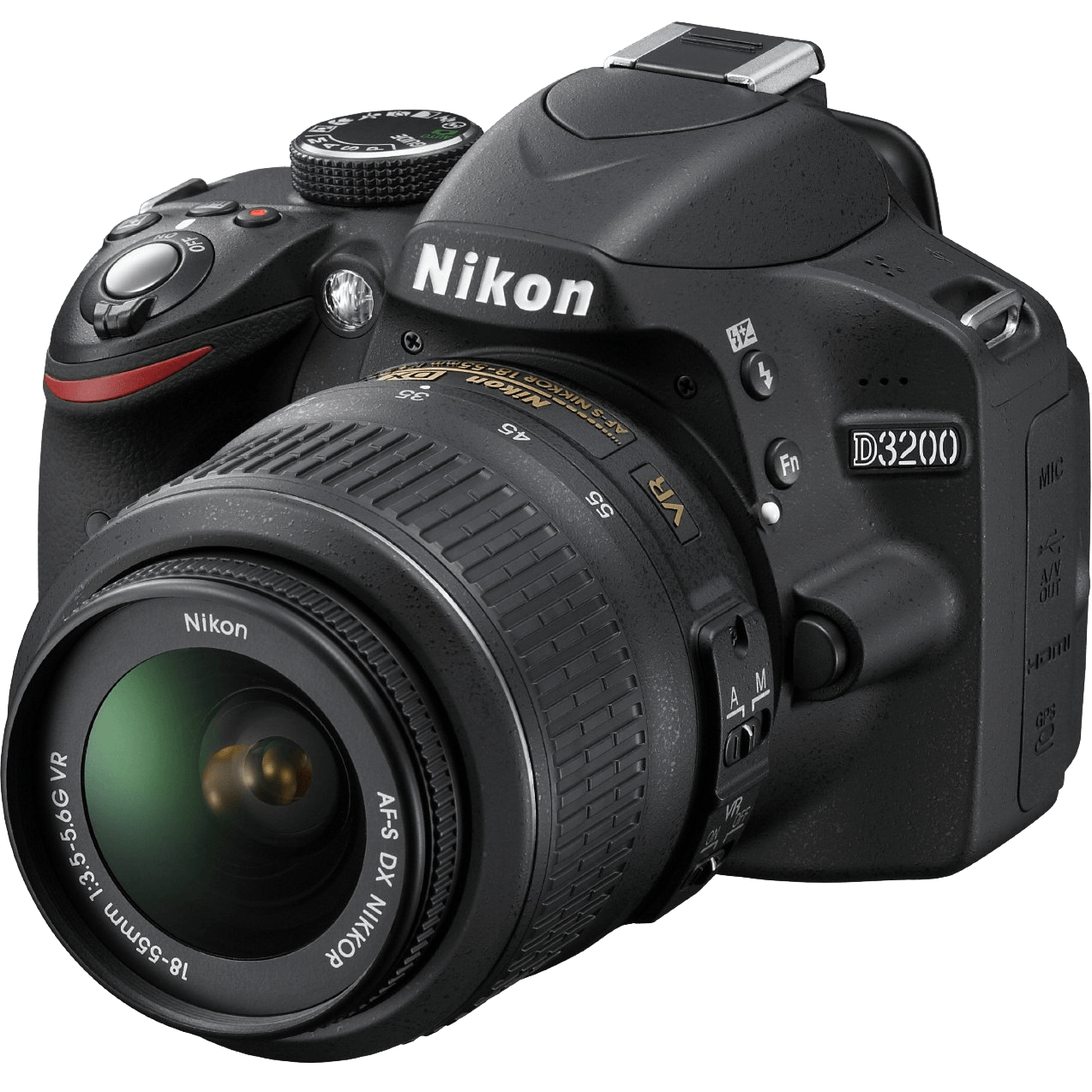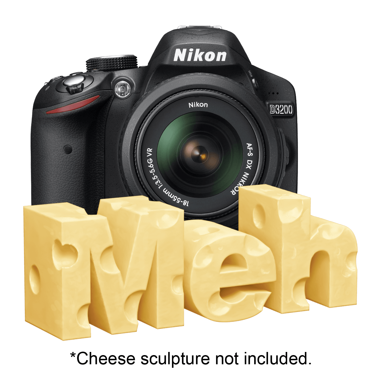 Specs ====- Model: D3200- Single-lens reflex digital camera###Shutter- Shutter speed: 1/4000 to 30 sec.- Shutter modes: Continuous, delayed remote, quick response remote, quiet shutter, self-timer, and single-frame- Top continuous shooting speed at full resolution: 4 frames per second- Self timer: 2, 5, 10, 20 seconds###Sensor:- Effective pixels: 24.2 million (24.2 megapixels)- Sensor: 23.2mm x 15.4mm- Image sensor: DX format, CMOS type- ISO sensitivity: ISO 100 -6400, Hi-1 (ISO 12,800)- Exposure metering: TTL using 420-pixel RGB sensor- Metering: Center-weighted, Matrix, Spot- Single point, dynamic (11 point), and auto-area focus###Lighting:- Built-in flash X-Sync speed: 1/200- White balance: Auto, Cloudy, Direct Sunlight, Flash, Fluorescent (7 types), Incandescent, Preset, Manual, Shade- Active D-Lighting###Monitor:- Live view shooting- Monitor size: 3in diagonal- Monitor: 160 degree Wide viewing angle TFT-LCD- Monitor resolution: 921,000 dots###Misc:- Storage: SD, SDHC, SDXC- Battery: Rechargeable Li-Ion- Dimensions: 5 x 3.8 x 3.1 in- Weight: 16 oz- Interfaces: Stereo 3.5mm audio input, HDMI type C output, Hi-speed USB, MC-DC2 remote cord (sold seperately), GP-1 GPS unit (sold seperately)###Picture and video:- Formats: JPG, RAW, MOV, NTSC or PAL- Built in microphone- Maximum video recording time: 20 minutes- Picture resolution: - L) 6,016 x 4,000- M) 4,512 x 3,000- S) 3,008 x 2,000- Video:- 1,920x1,080 / 30 fps- 1,920x1,080 / 25 fps- 1,920x1,080 / 24 fps- 1,280x720 / 60 fps- 1,280x720 / 50 fps- 640x424 / 30 fps- 640x424 / 25 fpsManufacturer specsProduct Brochure PDFUser Manual PDFQuick Reference Guide PDFCondition: NewWarranty: 1 Year NikonEstimated Delivery: 8/26 - 8/29Shipping: $5 or free with **VMP**What’s in the Box? ====1x Nikon D3200 camera1x 18-55 VR lens1x Rechargeable Li-ion battery (EN-EL14)1x Battery charger1x USB cable1x Audio video cable1x Lens cap1x Body cap1x Strap1x CD1x User manualPictures====Say Meeeh!CameraFront viewBack viewTop 3/4 viewPrice Comparison====$529.95 List, $446.95 at AmazonFind a relevant price comparison? Please share it in a comment in this thread