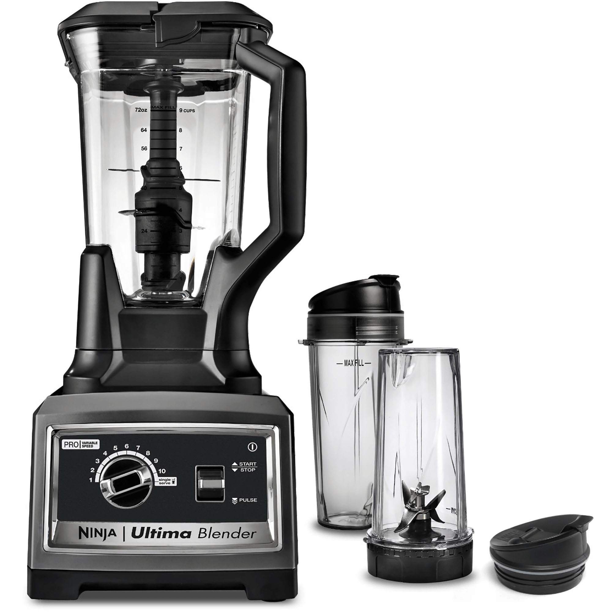 Specs====- Model: BL810- Includes 72oz pitcher and two 16oz single-serve cups with sip-and-seal lids- This blender goes to eleven: 10 speeds, plus a single serve speed. - 1500 watts, 2.5 Peak HP, 24,000 RMP- Dual stage blending (Total Crushing and High Speed Cyclonic)- Stainless steel blades- Dishwasher safe- BPA free- 14.6 lbsCondition - RefurbishedWarranty - 30 Day MediocreShips Via - FedEx SmartPost- $5 Shipping, Free with **VMP**What’s in the Box?====1x 72oz blender pitcher1x Ninja blender base2x single-serve cups2x single-serve lids1x single-serve blade assembly1x Instructional manualPictures====Look at all those blades!Ninja UltimaTiny blender cup on a big blender baseEverything in the boxMake salsaOr a delicious chocolate shakePrice Check====$199.99 at Amazon