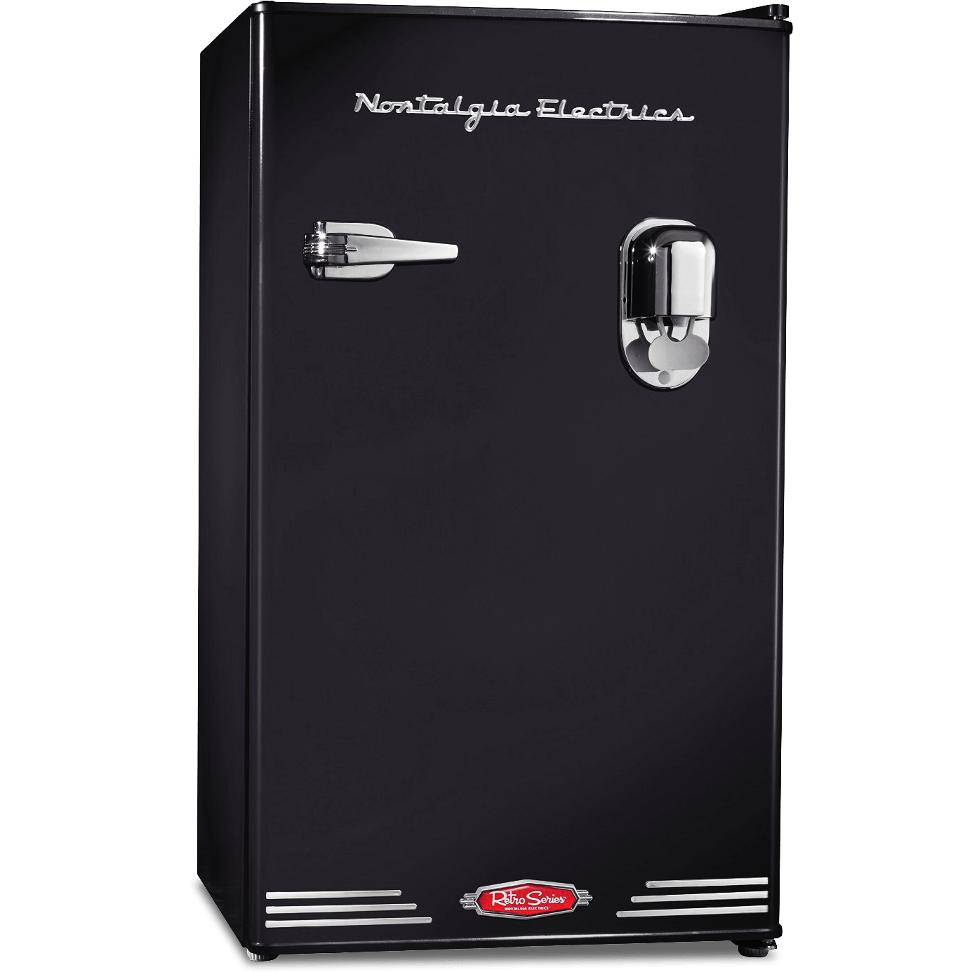 Specs ====- Model: RRF300DNCRED, RRF300DNCBLK- Weight: 46 Lbs- Dimensions: 18.7 W x 17.52 D x 33.07 H in- Power: 115 volts, 75 Watts, 60 Hz, 1.25 A- High side: 72.5 psi- Low side: 7.25 psi- Energy consumption: .849 kWh/24h- Refrigerant (oz): R600a/0.635oz- Foaming Agent: Cyclopentane- Temperature: <5F (freezer), 32F-46.4F (refrigerator)- Adjustable thermostat dial control- Beverage dispenser with one-liter tank- 10W interior light- Freezer compartment- Ice cube tray and ice scraper- Slide-out wire shelves- Two-liter bottle door storage- Adjustable feet- Cord length: 71 in- Climate class: ST- User manual downloadable PDFCondition: New Warranty: 1 Year Limited Nostalgia ElectricsEstimated Delivery: 3/11 - 3/13Shipping: $5 or free with VMP What’s in the Box? ====1x Nostalgia Electrics beverage dispensing refrigerator1x Ice scraper1x Ice cube tray1x Beverage dispenser tank1x Door handle and hardwarePictures ====RedBlackRed and blackBeverage dispenserBeverage containerTemperature knobWho doesn’t want to keep eggs and butter at work?Good morning!Price Check ====$199.99 at Amazon