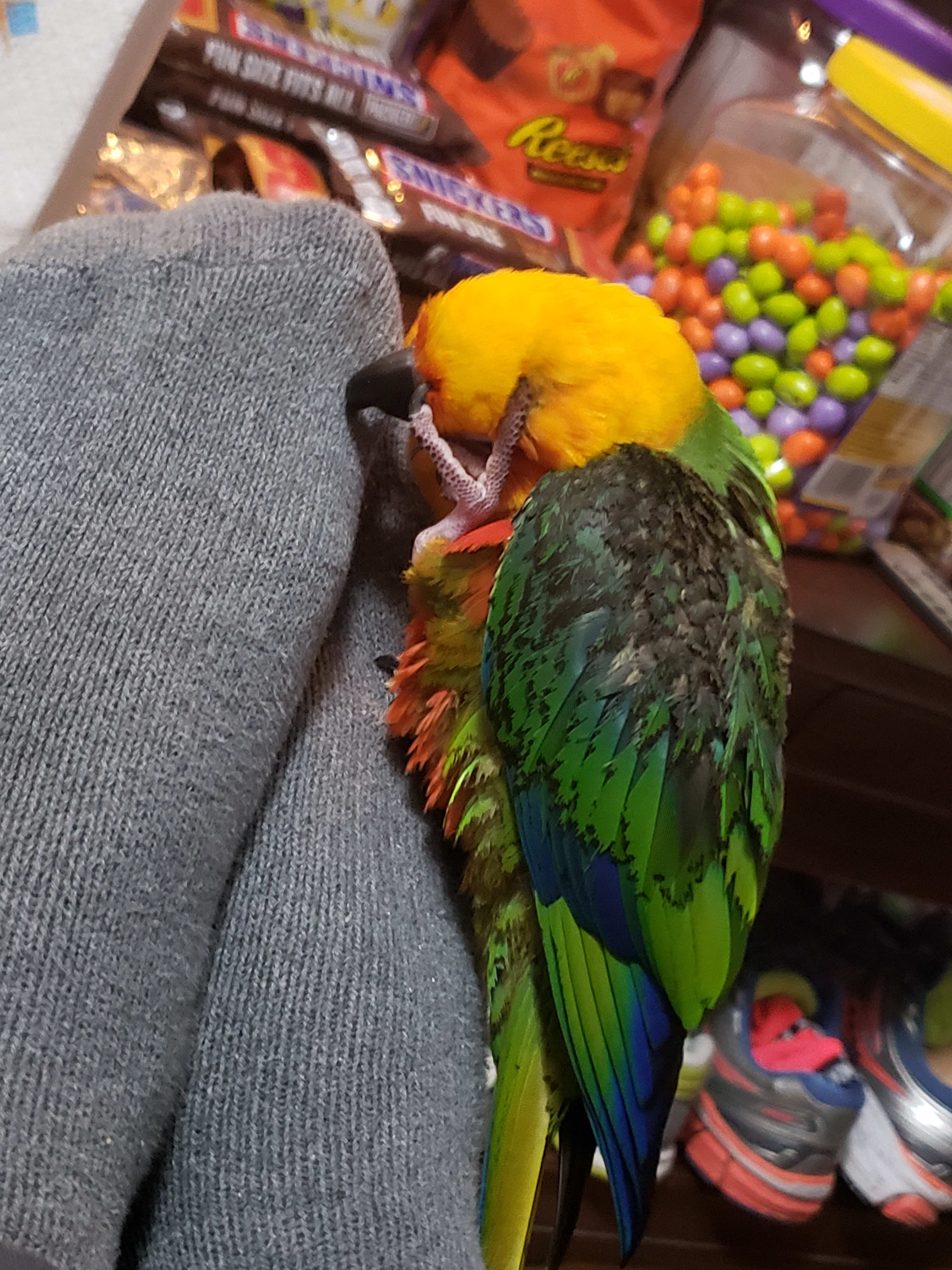 Have enough candy lol. I thought you were supposed to cover birds up at night so they slept? Or is that only certain kind of birds? Does yours just have free range of your house?