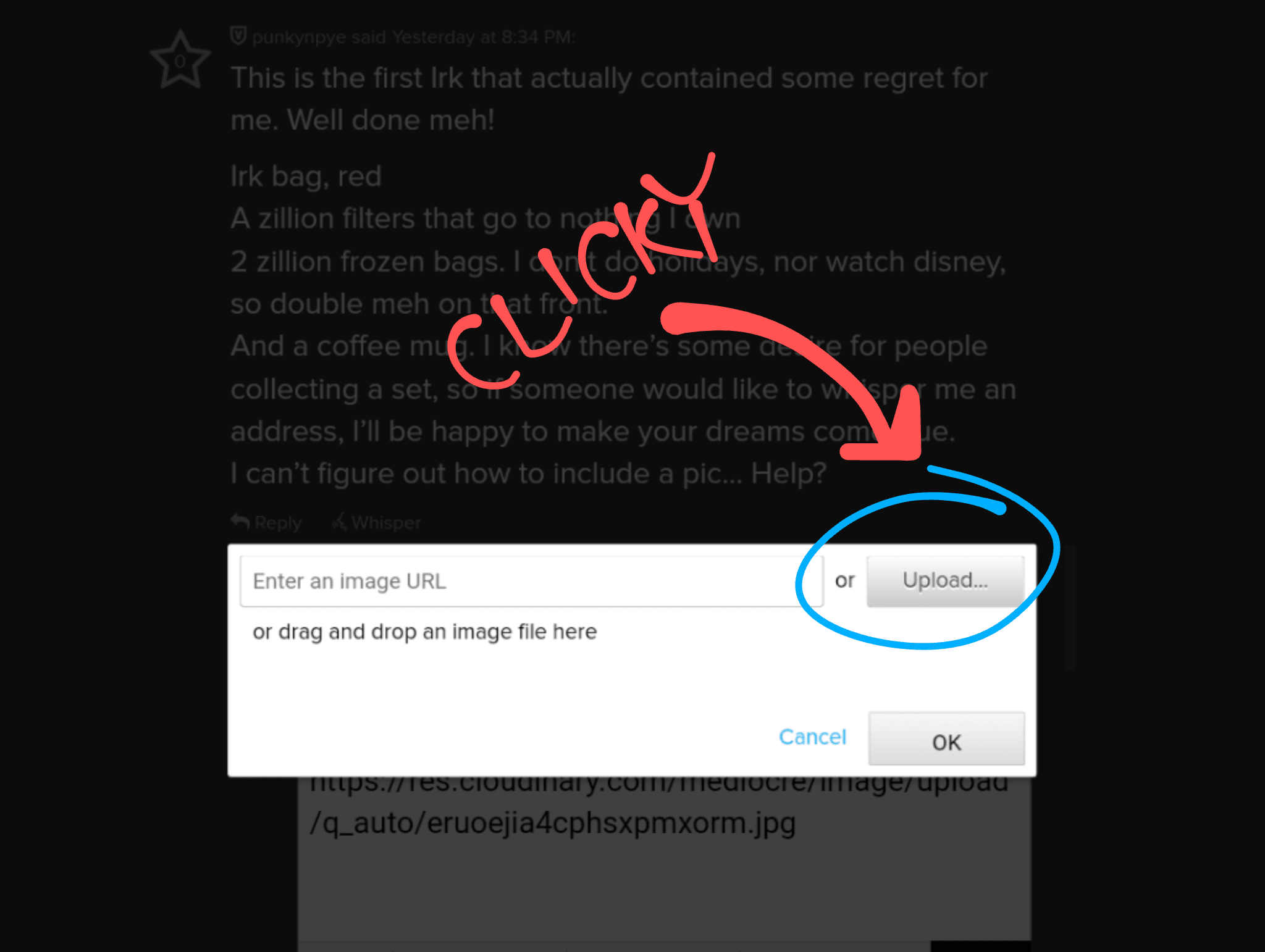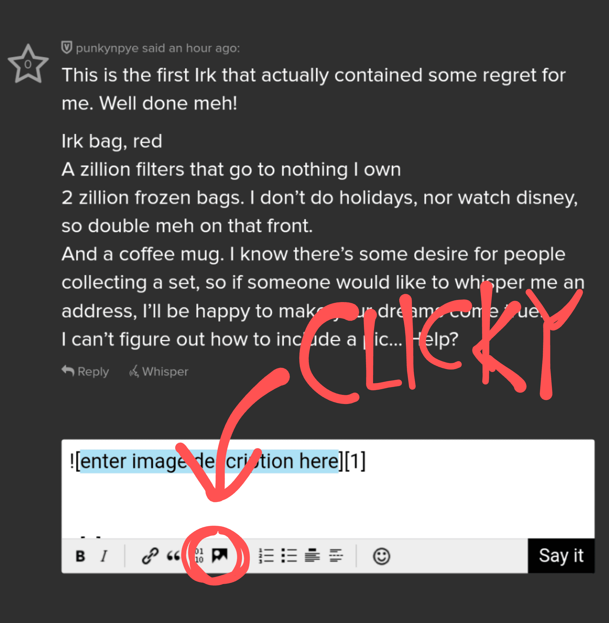 I can’t figure out how to include a pic… Help?
