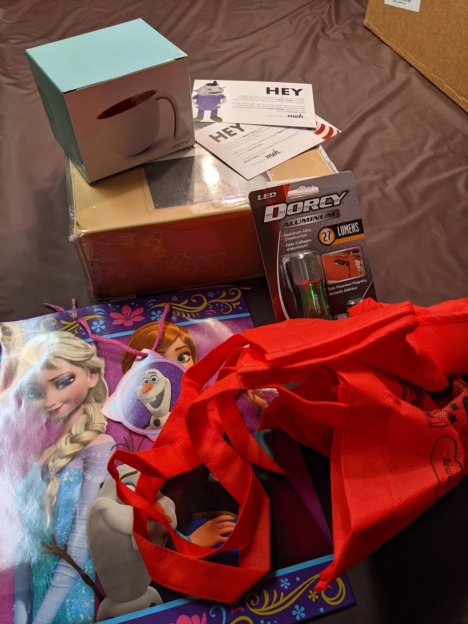 IRK bag, 2 Absobu mugs (both intact!), 3 dozen Frozen gift bags, and some lasagna noodles.