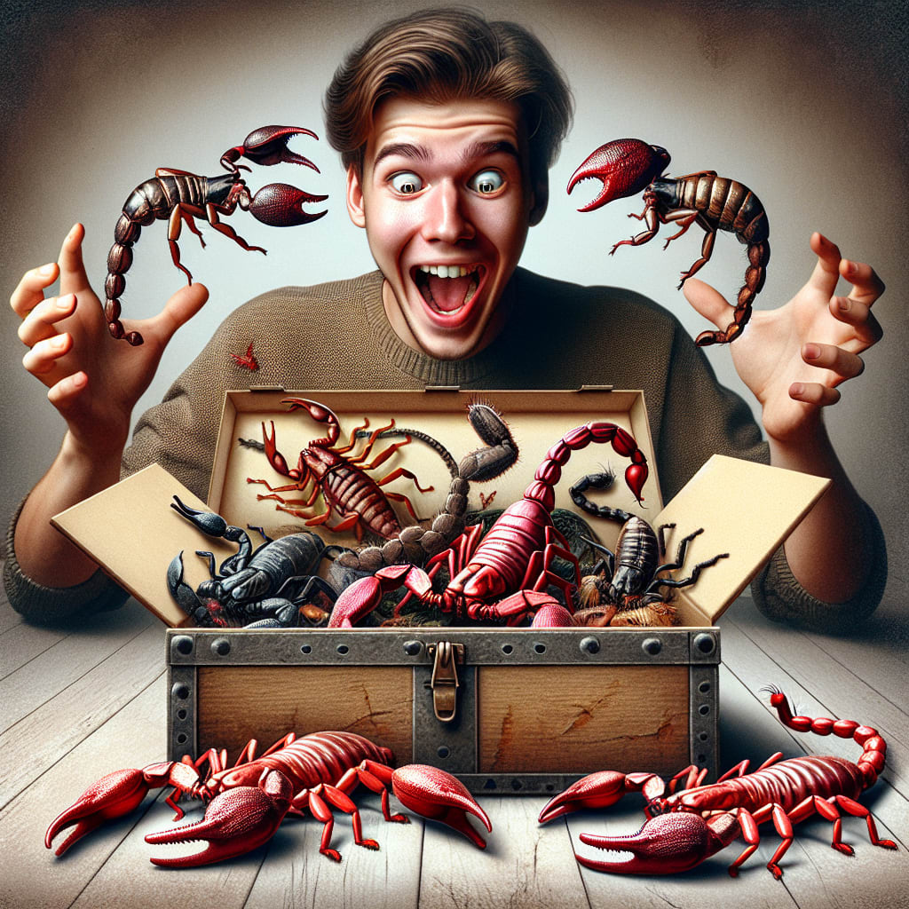 /showme someone excitedly opening a box full of deadly scorpions and other venomous creatures.