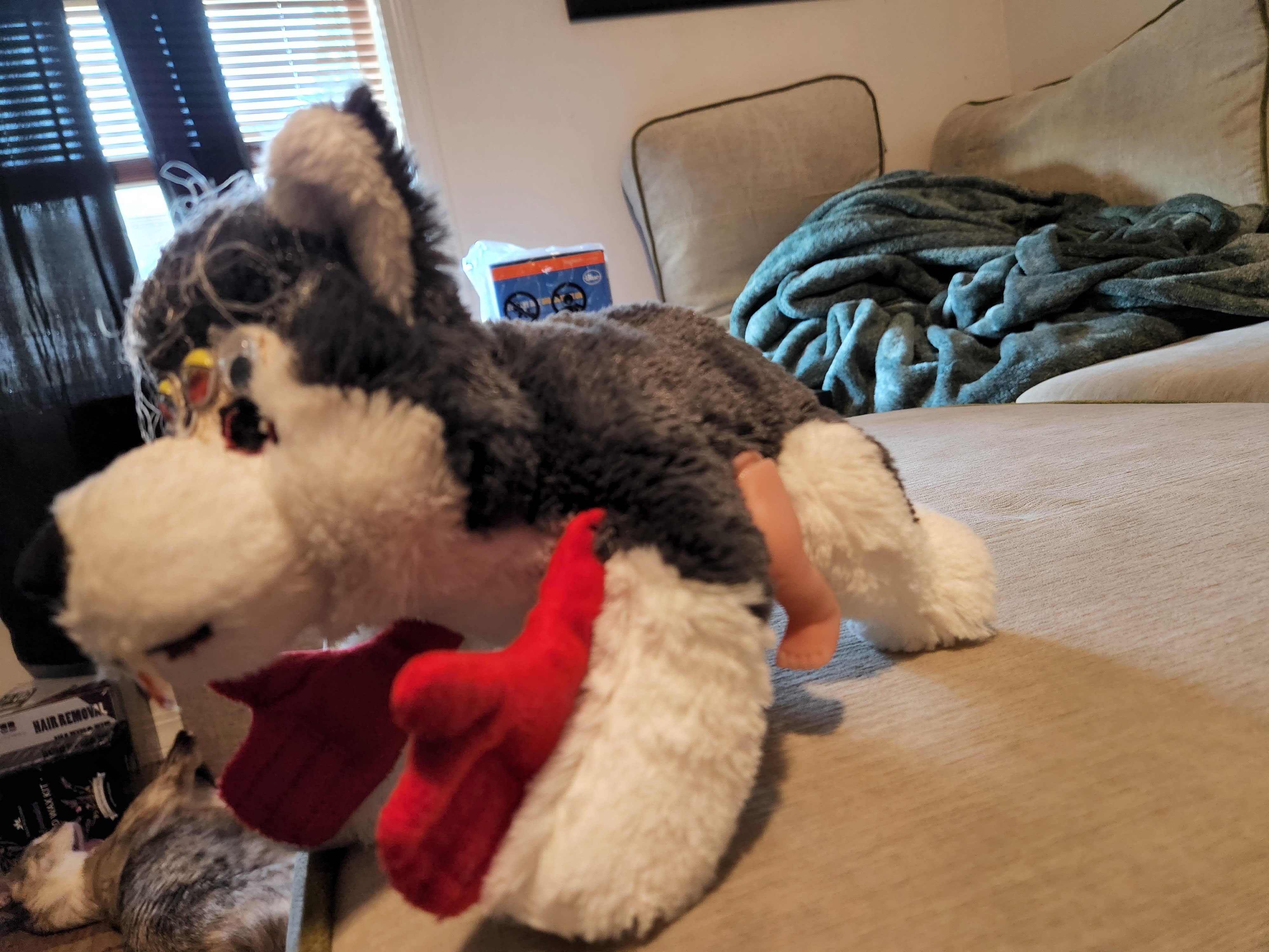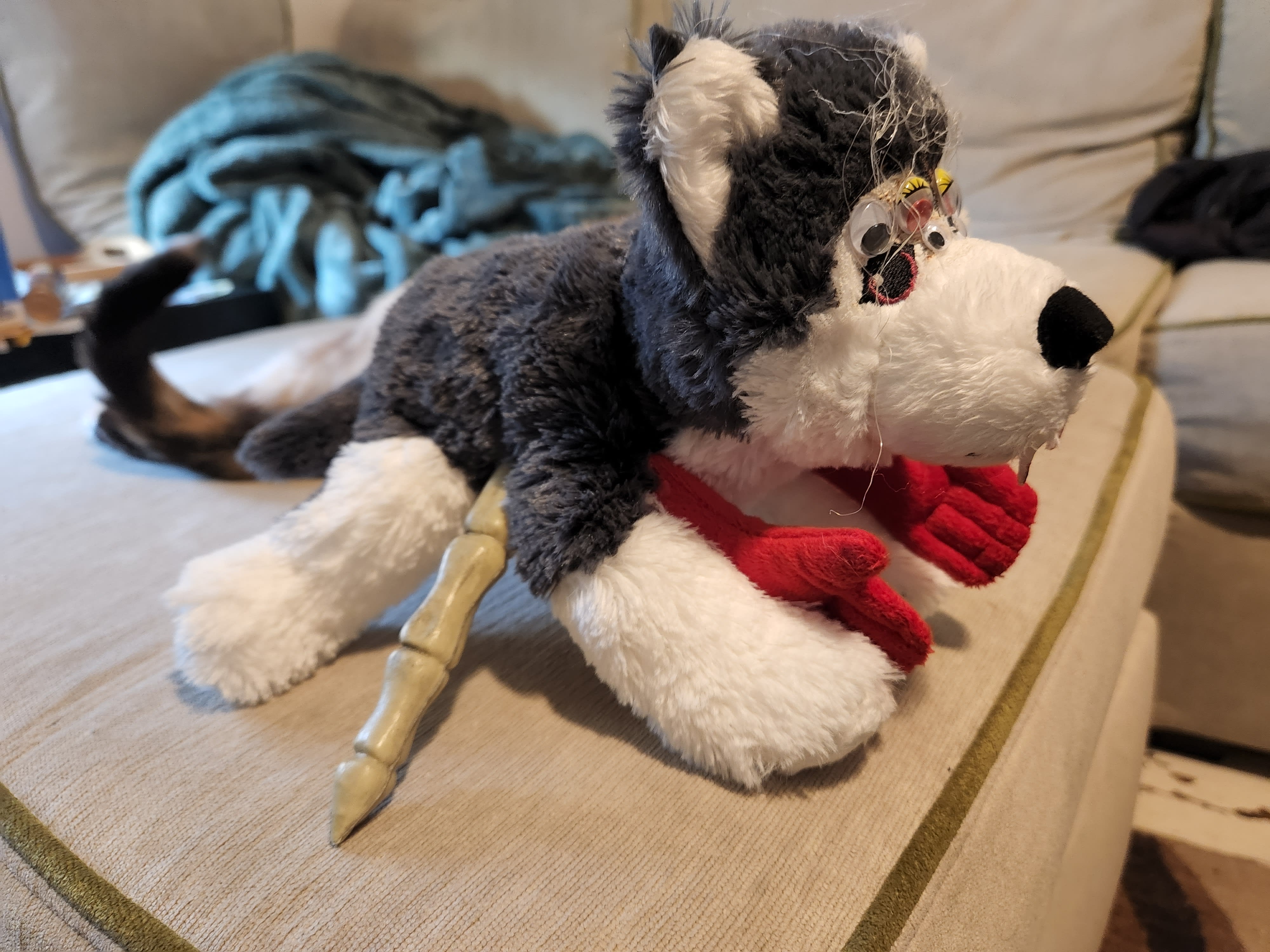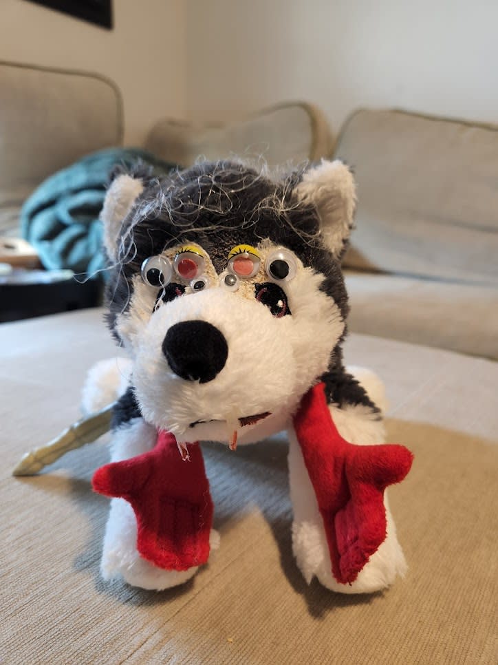 This is spiderdog, while looking for a plush to use as my base I also found this weird heart with arms that can hug stuff so I got that too, not really set on a plan yet. I decided to use the arms, and then frankenstien some more legs on, once I had more legs more eyes seemed like an obvious choice, thus spiderdog.