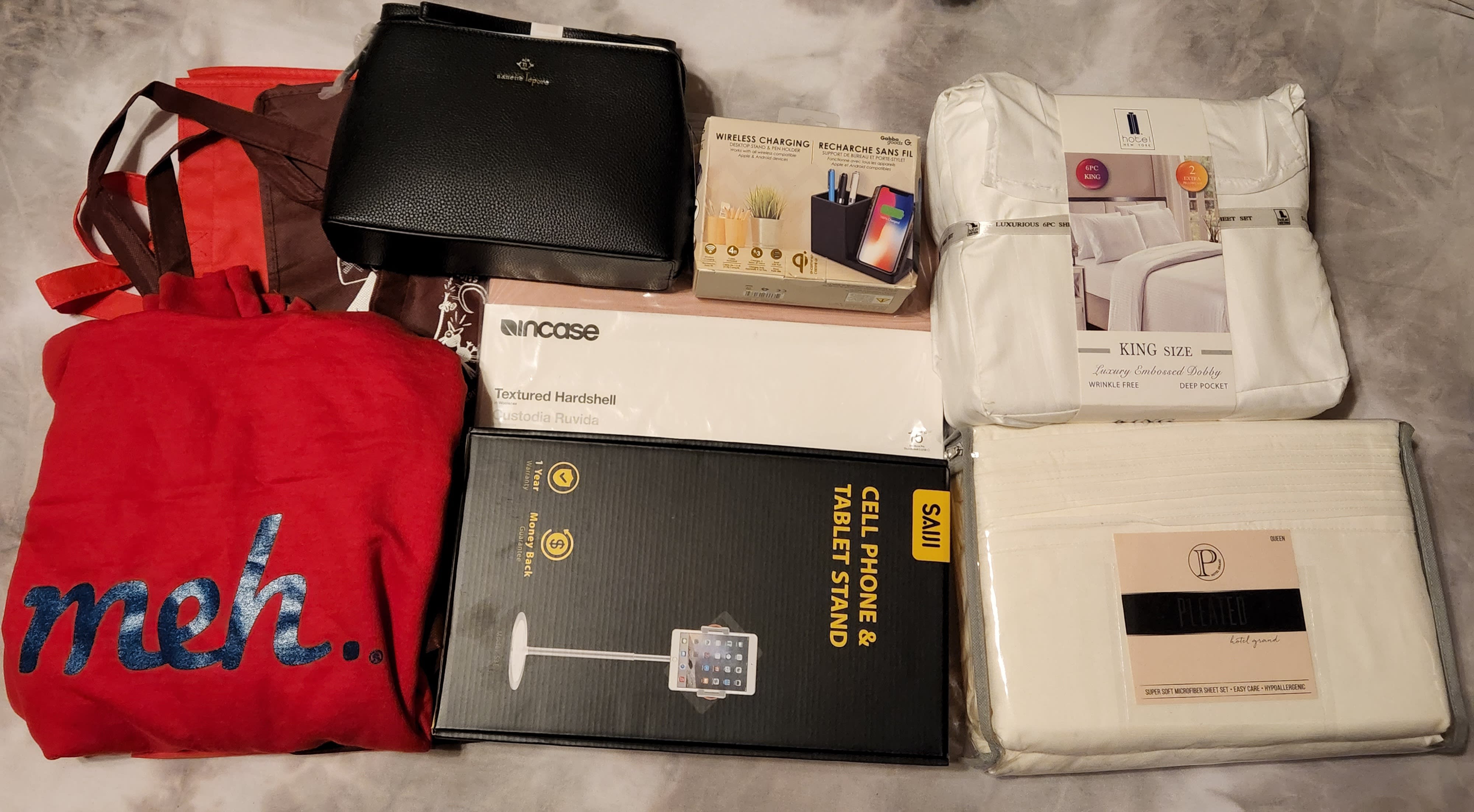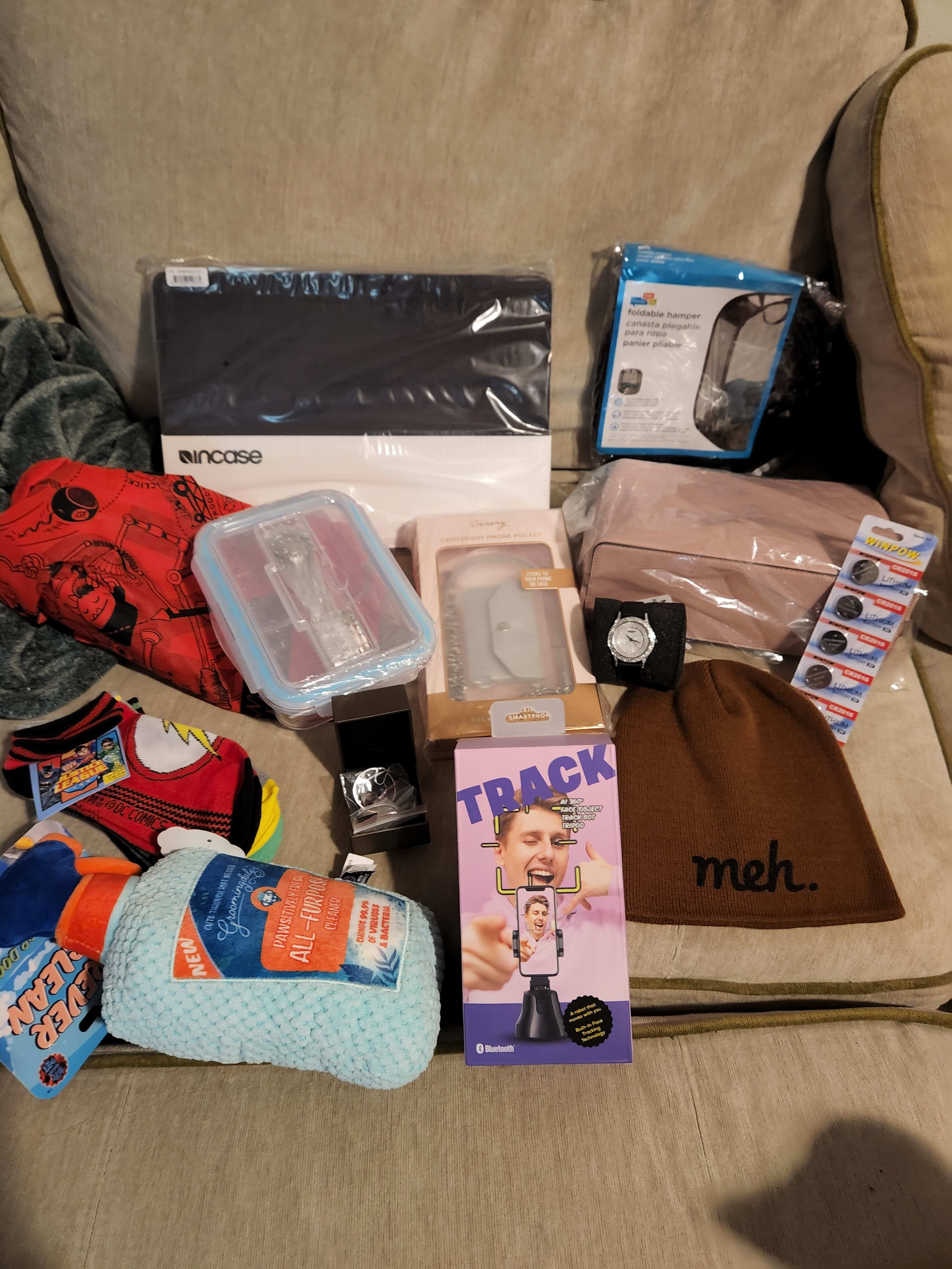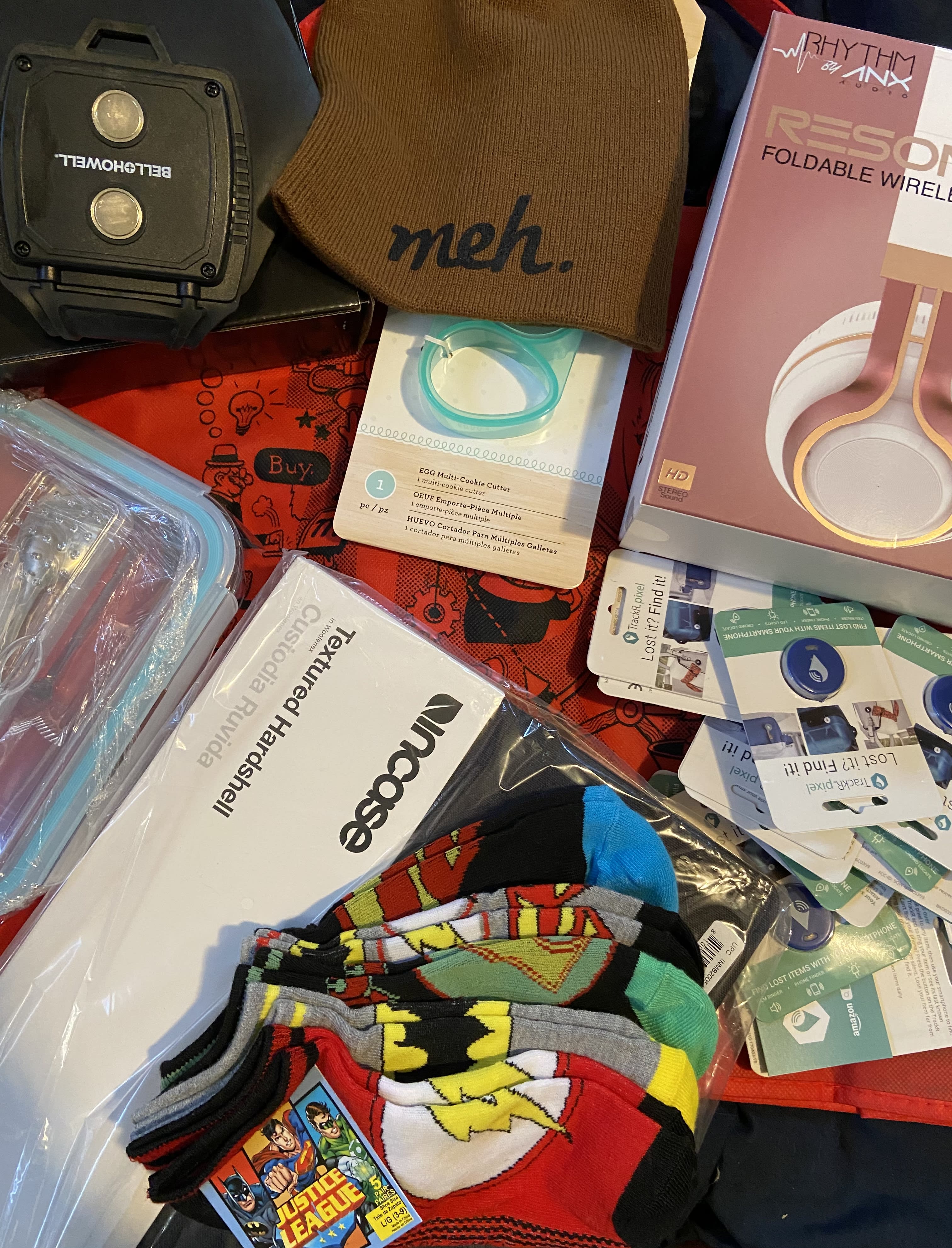 I love my not-a-winner irk! Thank you! Child size justice league socks, egg cookie cutter, a wallet that will charge my phone, two kids get dressed puzzles, a meh dunsel, laptop case, red bag, and a glass compartment lunch carrier thing! Thank you!