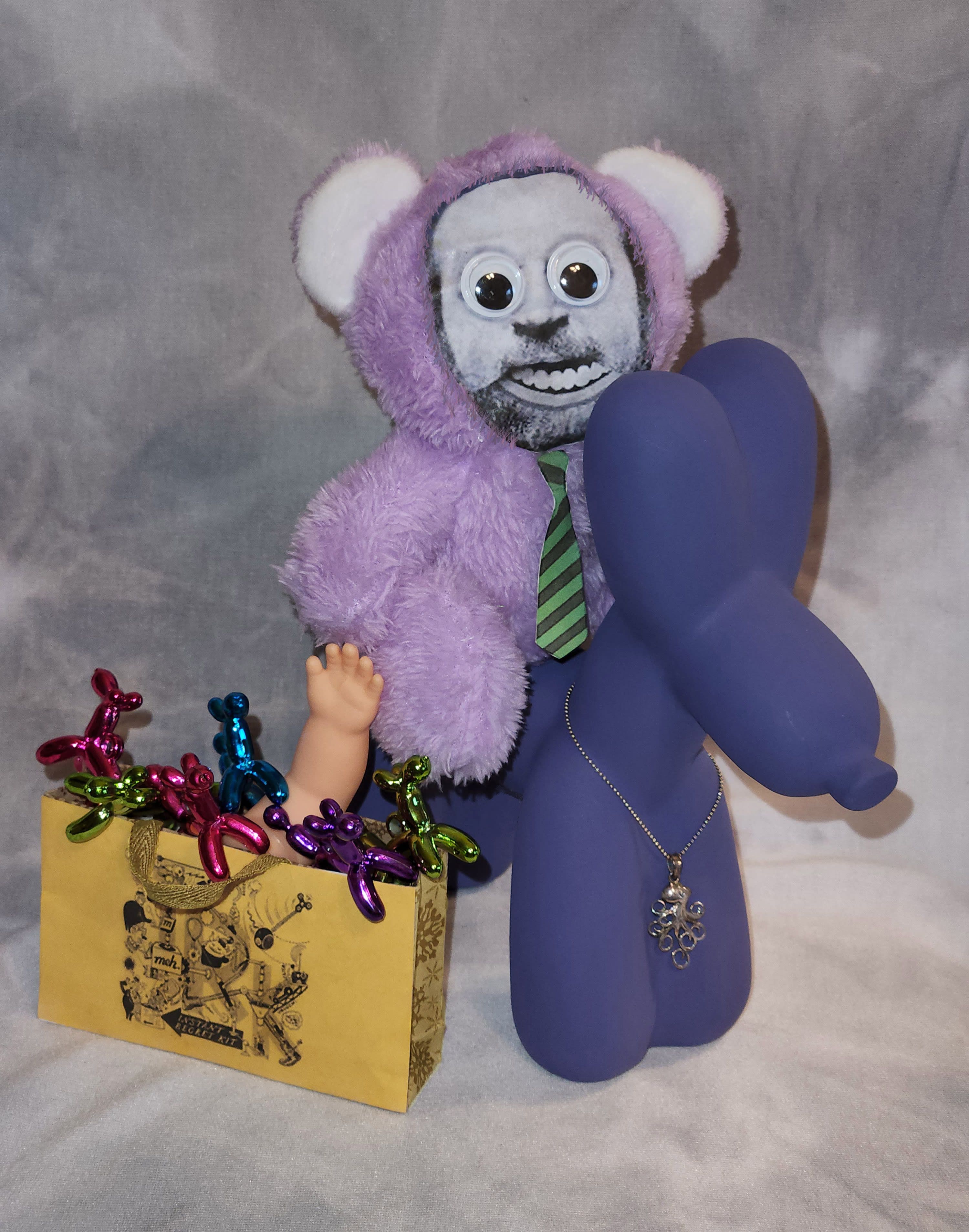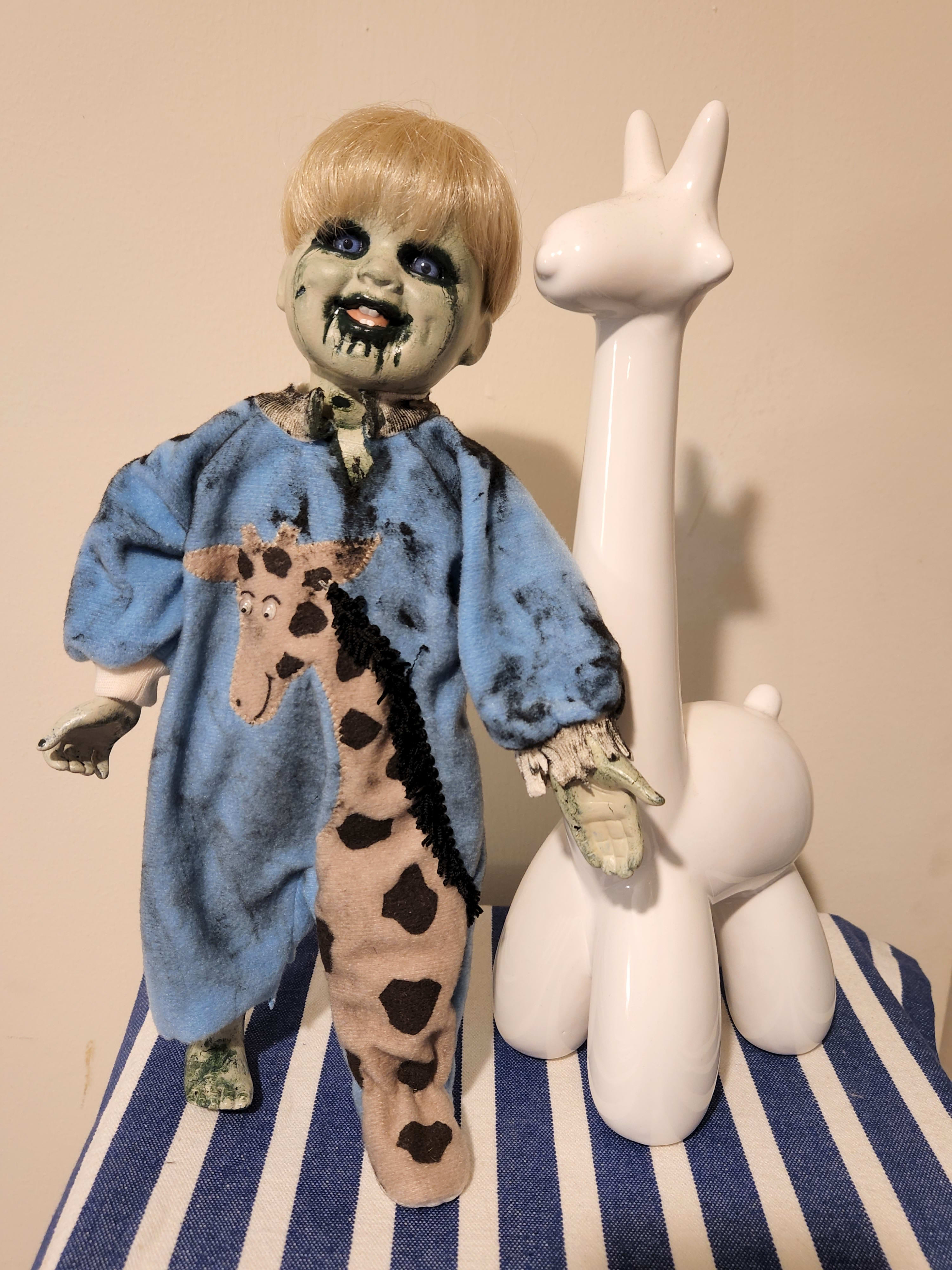 1 Incredibly Awesome Koolhandjoe Monsterified Ashton Drake Porcelain Little Stevie Doll. Stevie is posing here with a balloon giraffe to coordinate with the giraffe applique on his outfit. Accessorizing is so important.