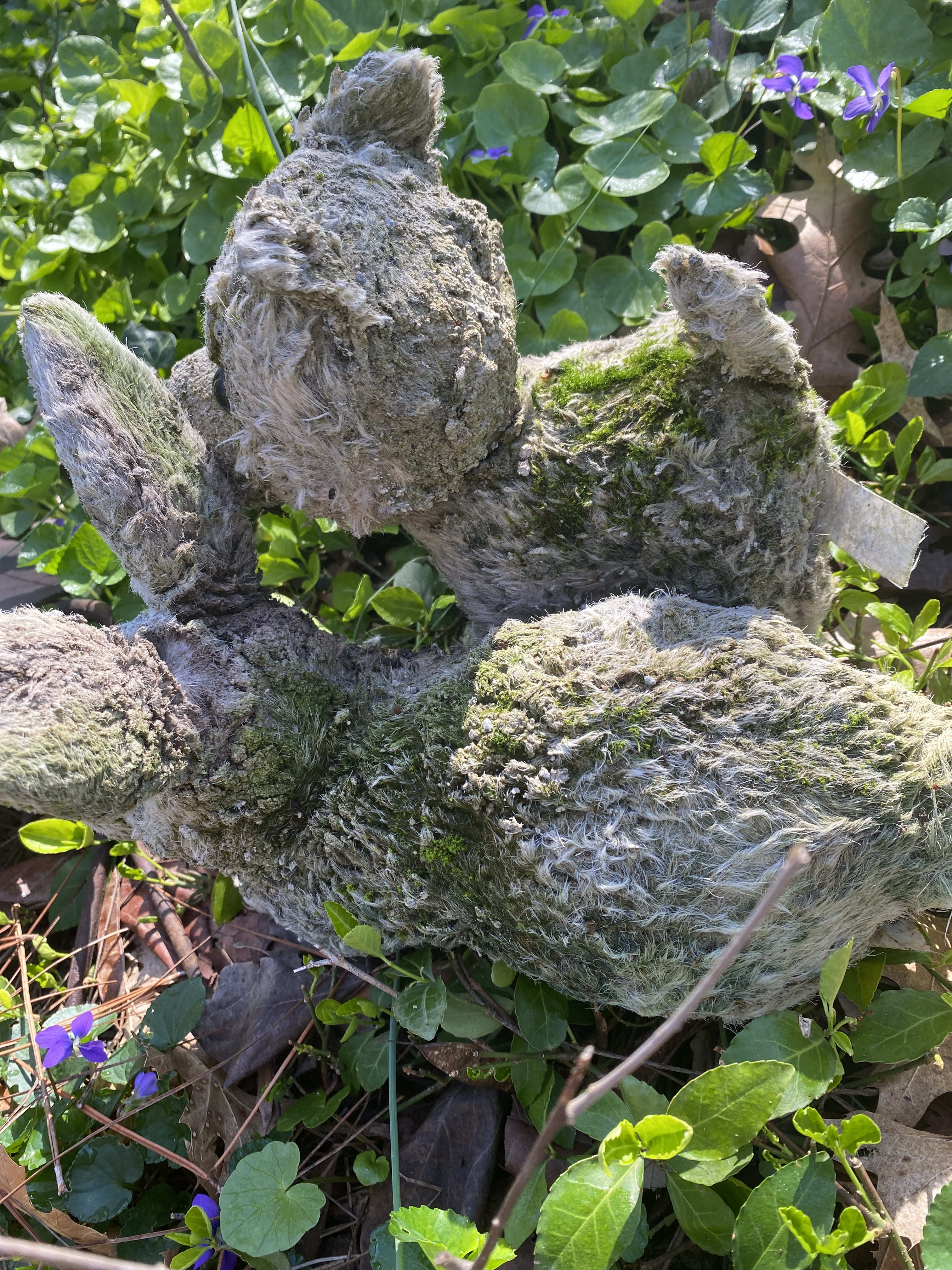 I can’t win because I won the Christmas ornament monsterfy (thank you Joe!), but I wanted to share. On Pinterest, they showed lots of cute little projects where you take a stuffed animal and encase it in concrete and make adorable little yard ornaments. So I bought some stuffed animals at the thrift store, mixed up concrete, slathered it on, wiped there a little plastic eyes clear, and ended up with scared sad little guys with their souls trapped inside. They are the creepiest things. The concrete started wearing off so they’re patchy and there’s moss growing on them and they huddle in fear hoping someday to be free. I can’t wait to make more!