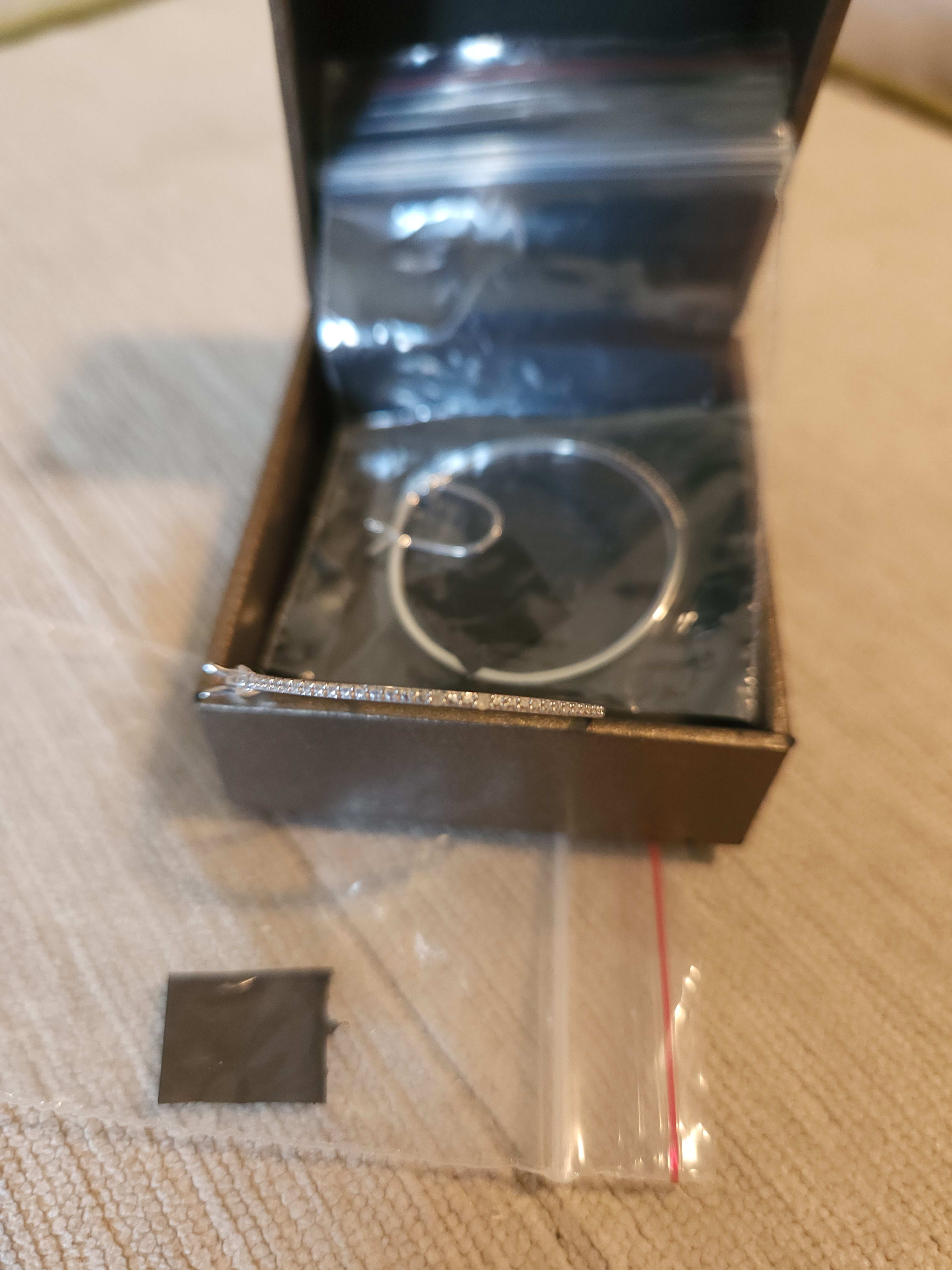 @Star2236 A pair of hoop earrings which I have to assume are real diamond, since each one has 2 tiny grey stones that look worse than the metal detailing around them.
