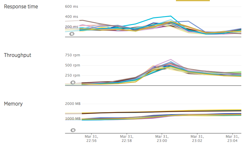 Throughput had increased as expected but CPU and memory usage were holding steady.