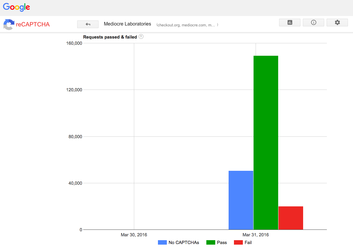 Here's a weird thing though. The numbers of CAPTCHAs being attempted increased by tens of thousands. See if you can spot the difference between March 30, 2016 and March 31, 2016 (Central Time) in this Google reCAPTCHA graph: