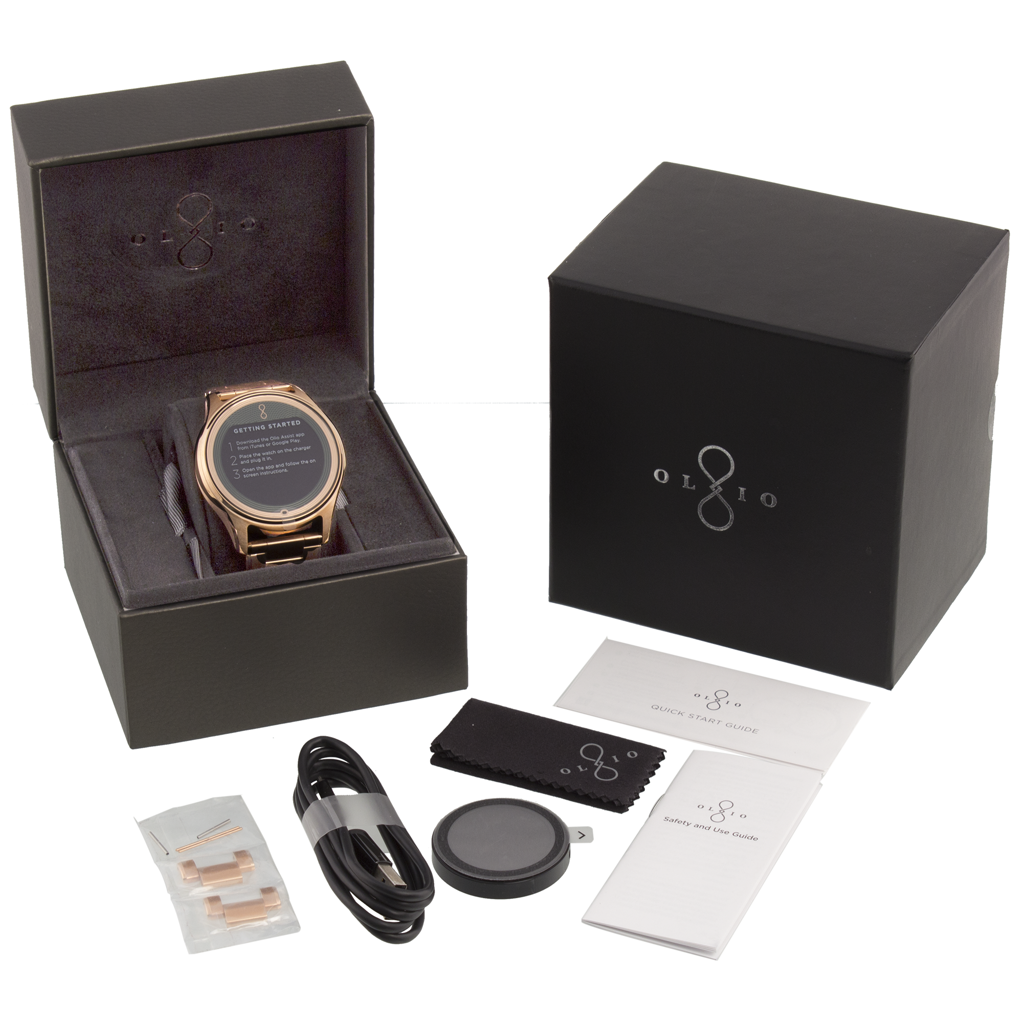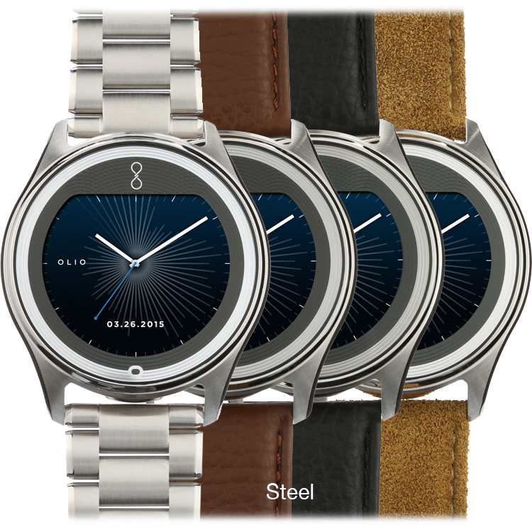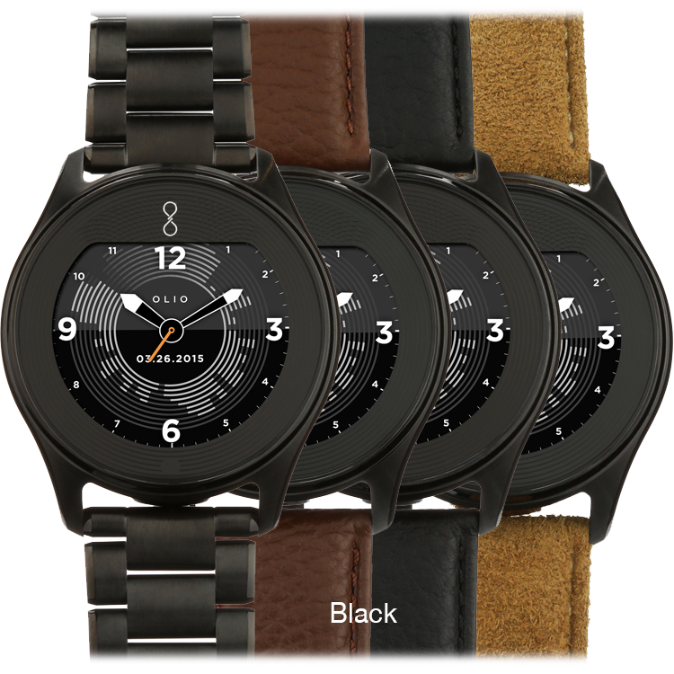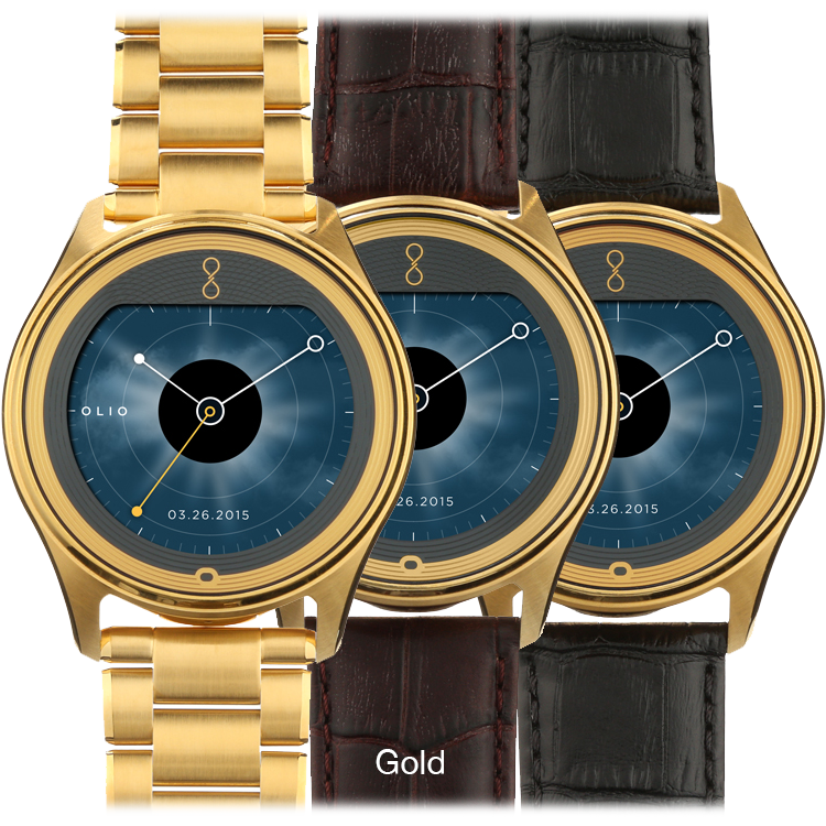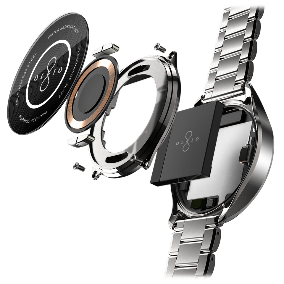 Specs ====- Model: H1B-SKU-02 - H1B-SKU-15- Condition: New- 316L stainless steel case- Natural finish, black PVD, 24-karat gold, 18-karat rose gold- Brushed with hand polished accents- Sapphire glass or high-impact ion-exchange glass cover- Guilloch textured cover artwork- Olio’s signature copper rapid-charging coil- 50M water-resistant- Dual-mode Bluetooth 4.0 & LE- Compatibility: iPhone (version 9.1 or higher), Android (version 4.4 or higher)- Dimensions - 47 mm case diameter - 12 mm case depth - 81 grams with genuine leather band - 161 grams with steel link braceletWatch Faces Per Style====- Gold: Clear sky dial with sunfire yellow accents- Rose: Eclipse astral dial with turquoise accents- Steel: Radiant white markers with ice blue accents- Black: Technical dial with burnished gold accents What’s in the Box? ====1x Watch1x Wireless Charging Disk1x Charging Cable 2x Extra Links with pins (Metal Band Models)1x Polishing Cloth1x Quick Start Guide1x Safety & Use GuidePictures====All WatchesSamplingWhats In The Box?Lines upOthersMoreMOREBandBack of the watchExplodedPrice Comparison====$595 - $1300 List, $1365.86 at Amazon