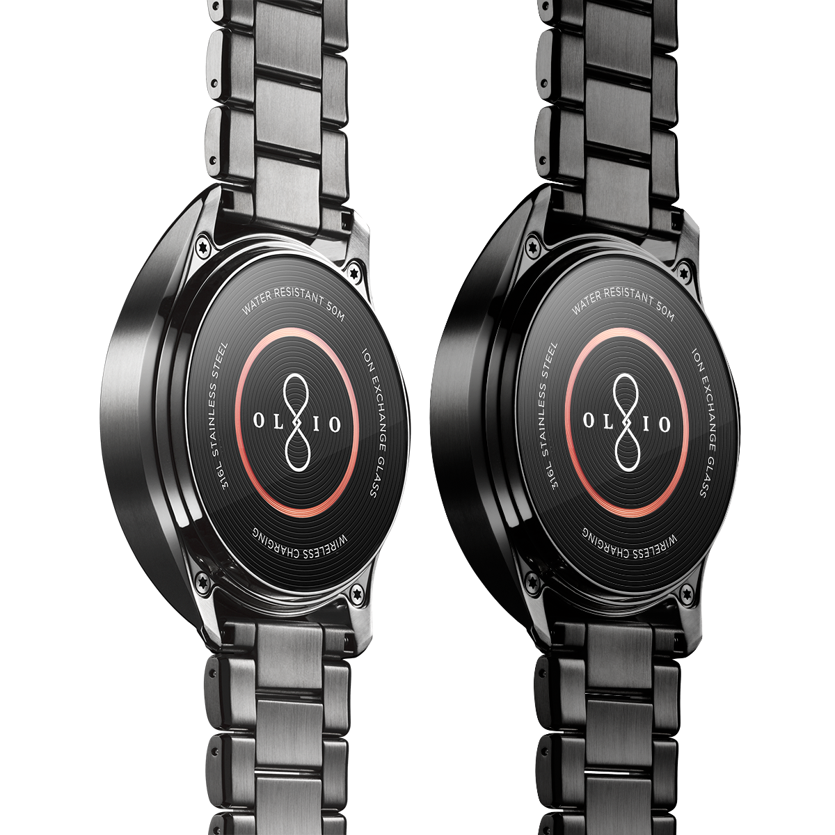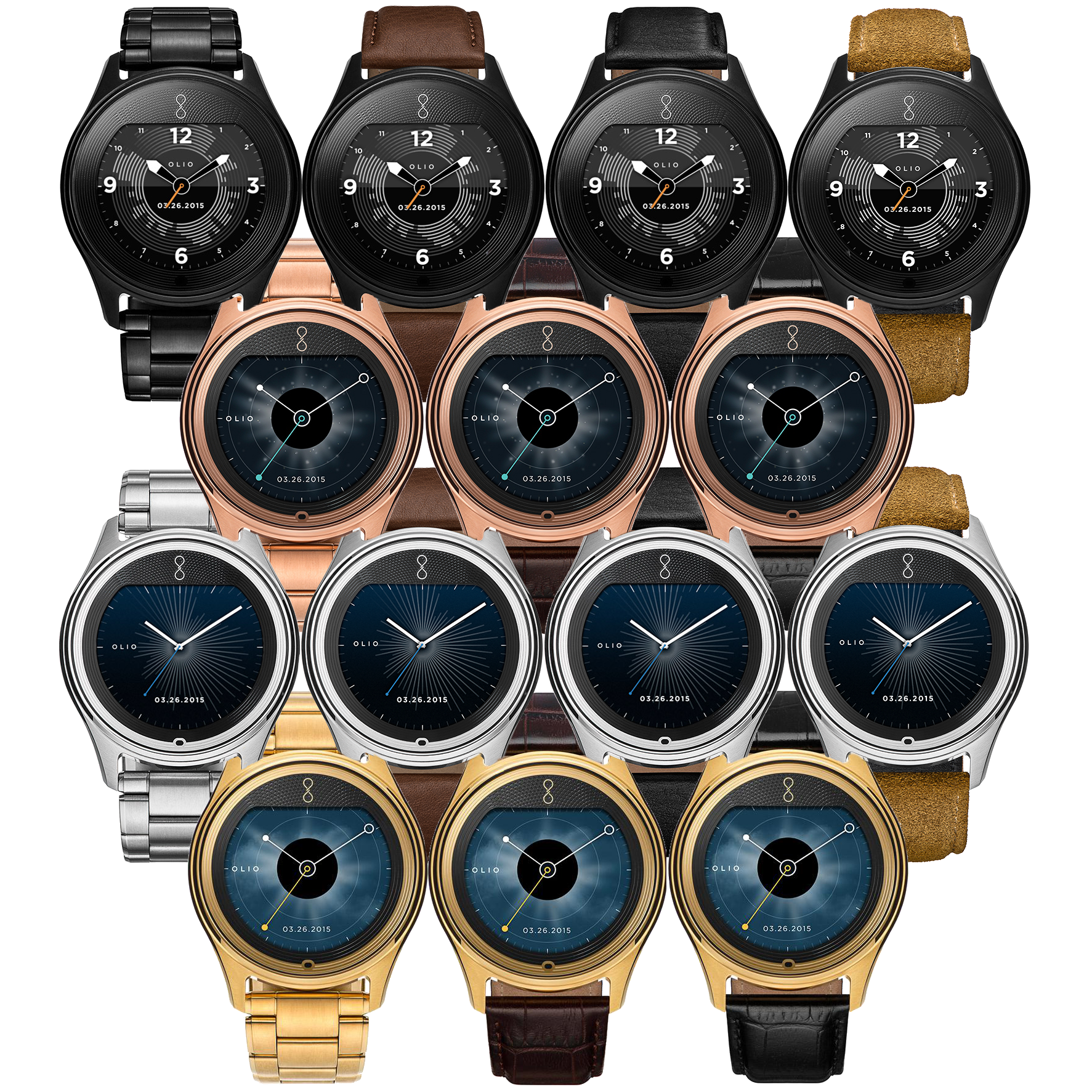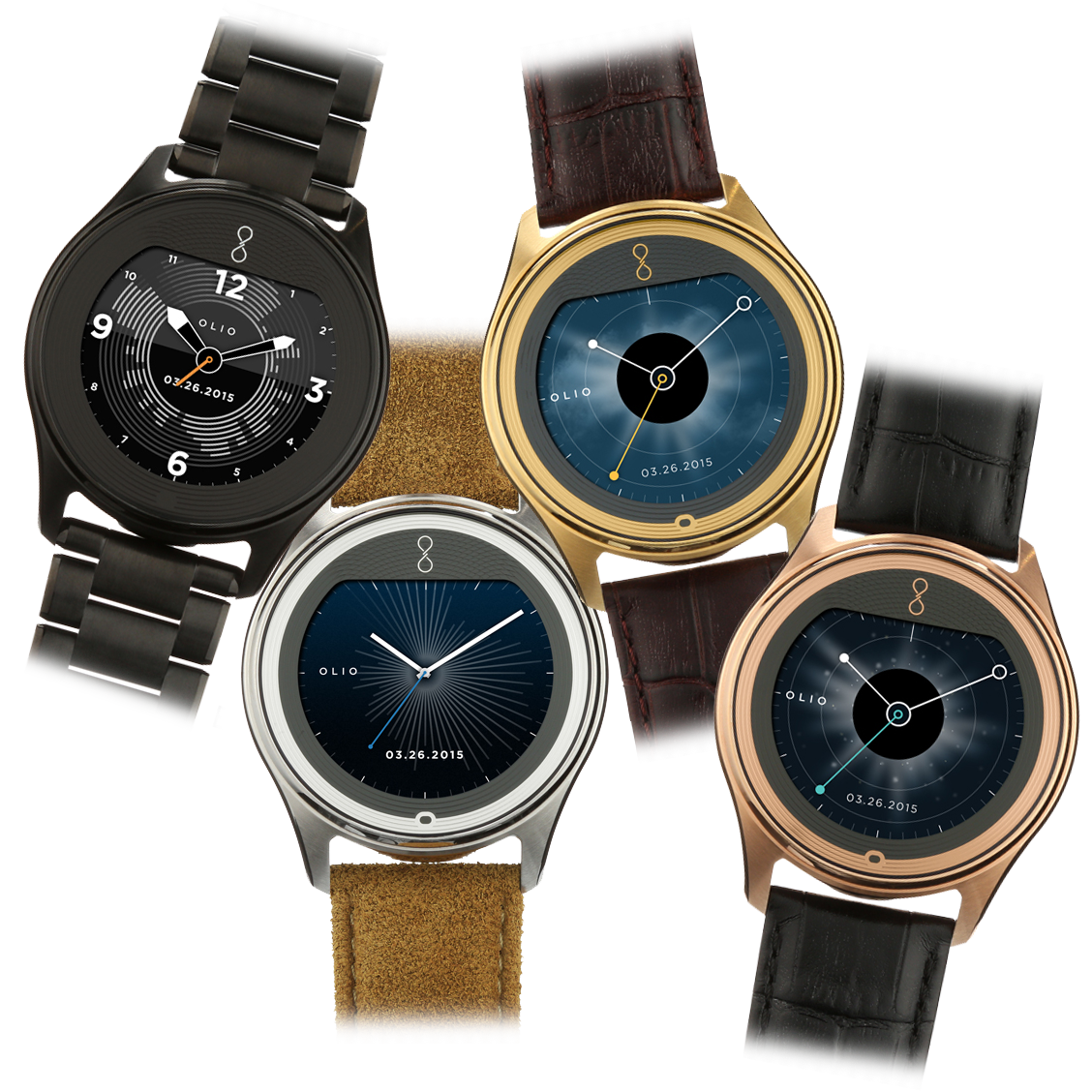 Specs ====- Model: H1B-SKU-02 - H1B-SKU-15- Condition: New- 316L stainless steel case- Natural finish, black PVD, 24-karat gold, 18-karat rose gold- Brushed with hand polished accents- Sapphire glass or high-impact ion-exchange glass cover- Guilloch textured cover artwork- Olio’s signature copper rapid-charging coil- 50M water-resistant- Dual-mode Bluetooth 4.0 & LE- Compatibility: iPhone (version 9.1 or higher), Android (version 4.4 or higher)- Dimensions - 47 mm case diameter - 12 mm case depth - 81 grams with genuine leather band - 161 grams with steel link braceletWatch Faces Per Style====- Gold: Clear sky dial with sunfire yellow accents- Rose: Eclipse astral dial with turquoise accents- Steel: Radiant white markers with ice blue accents- Black: Technical dial with burnished gold accents What’s in the Box? ====1x Watch1x Wireless Charging Disk1x Charging Cable 2x Extra Links with pins (Metal Band Models)1x Polishing Cloth1x Quick Start Guide1x Safety & Use GuidePictures====All WatchesSamplingWhats In The Box?Lines upOthersMoreMOREBandBack of the watchExplodedPrice Comparison====$595 - $1300 List, $1365.86 at Amazon