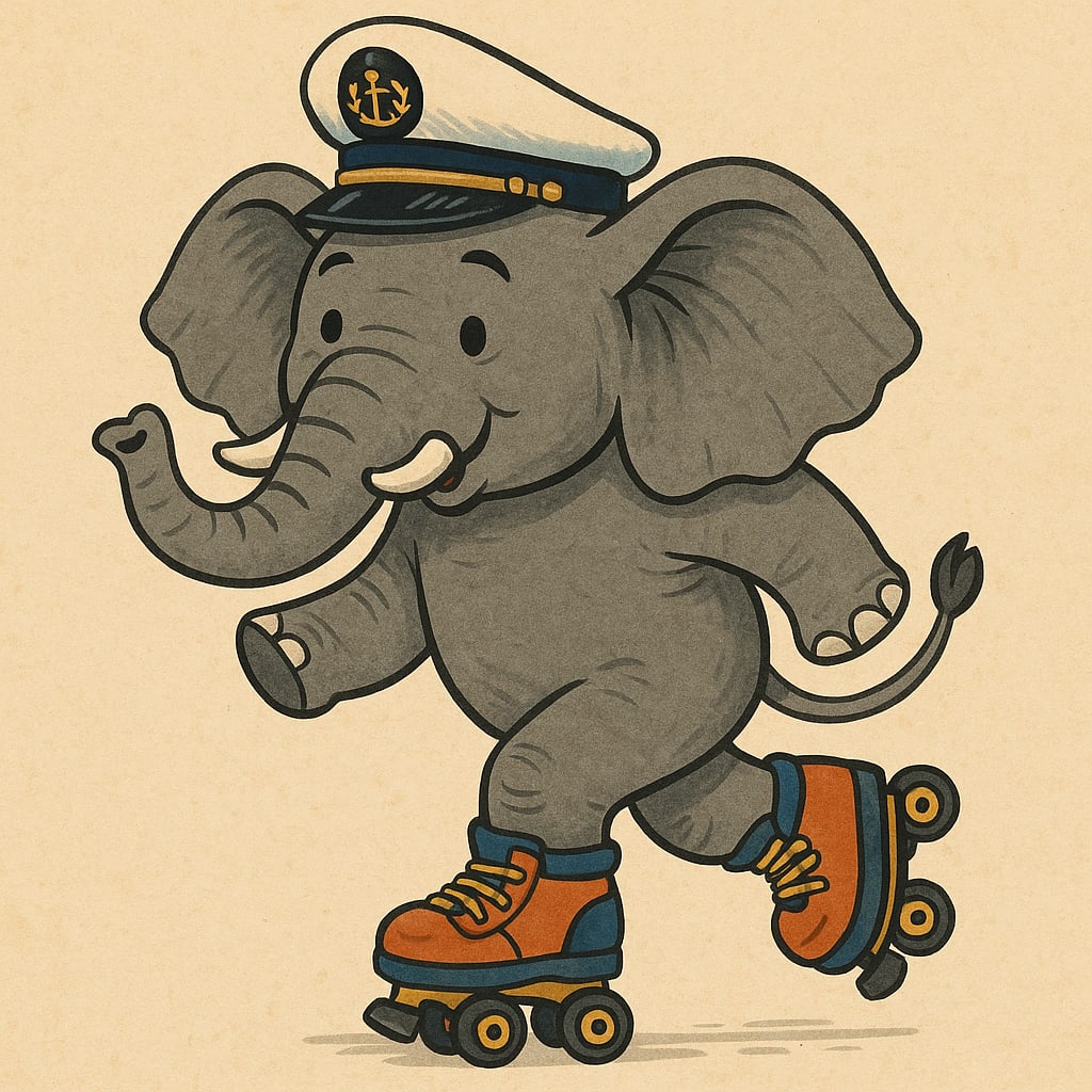 /showme an elephant in rollerblades wearing a captain’s hat.