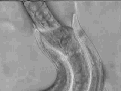 “Once he recognizes a hermaphrodite worm, the male nematode begins tracing the hermaphrodite with his tail until he reaches the vulval region. The male then probes the region with his spicules to locate the vulva, inserts them, and releases sperm.”