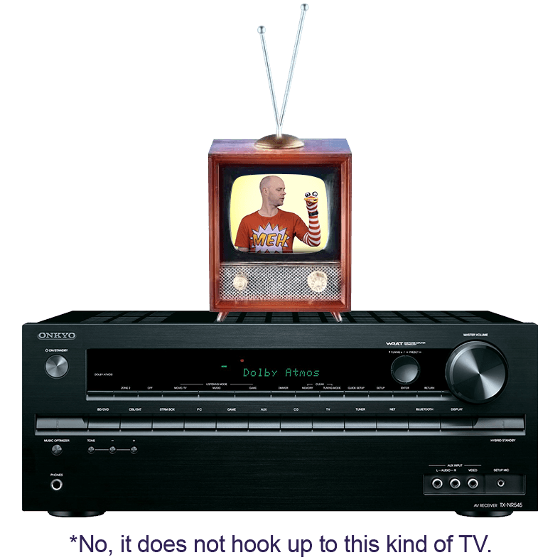 My 32" TV sits on top of a Bose-for-old-people speaker. Funny sounds comes out when Family Guy is on, and squishy sounds come out when The Walking Dead is on. This Onkyo box won't make FG funnier or TWD squisher.