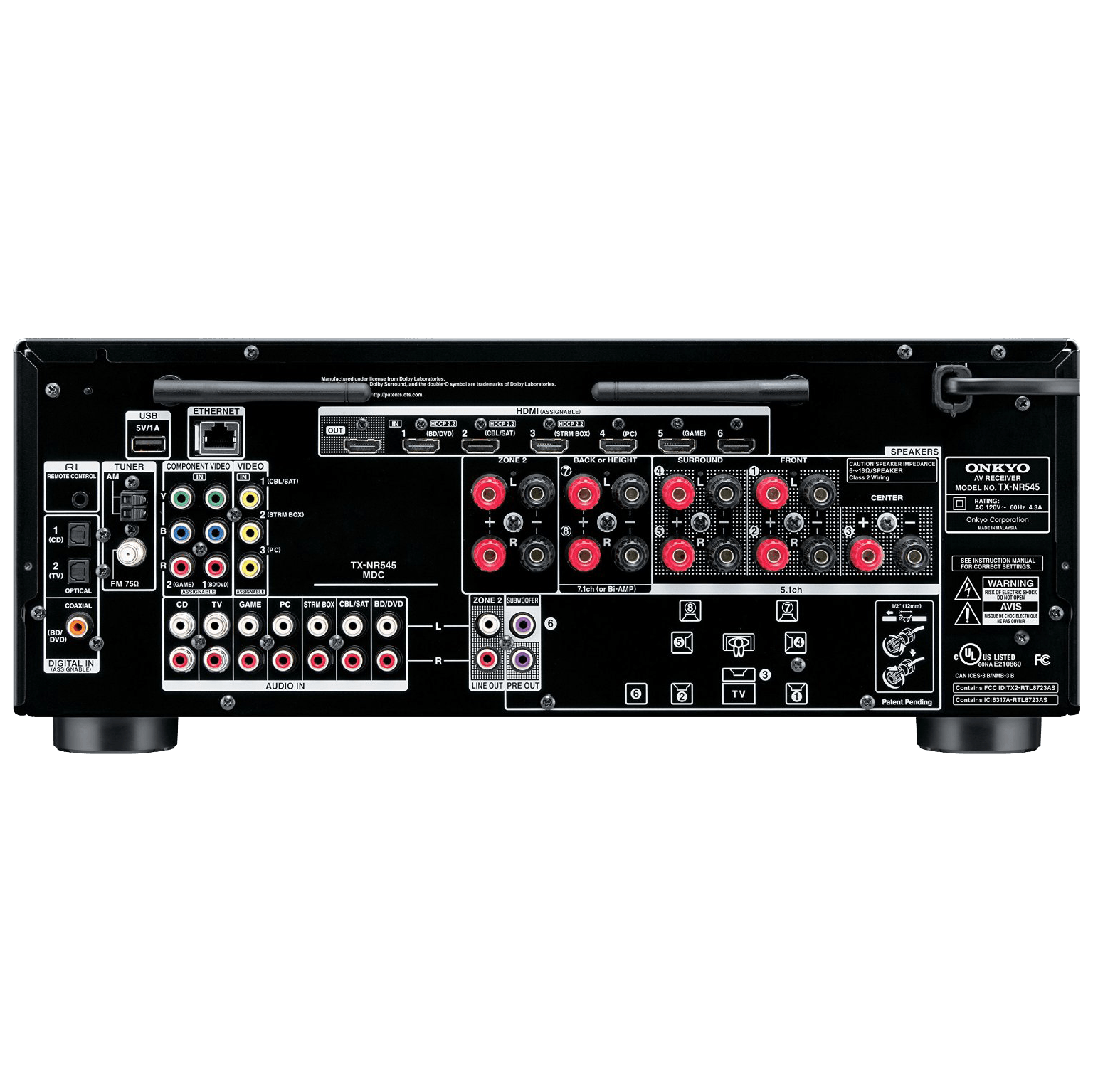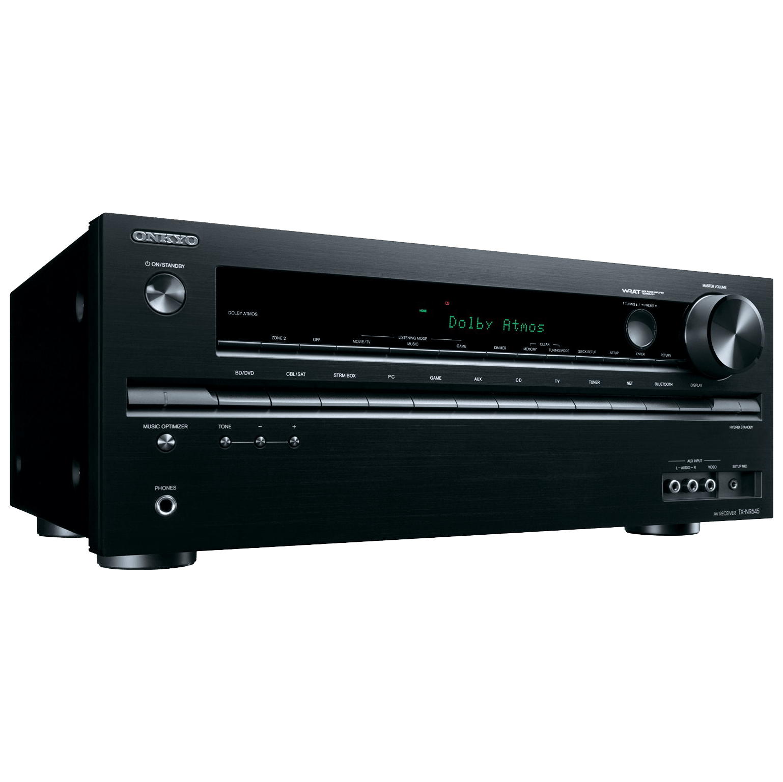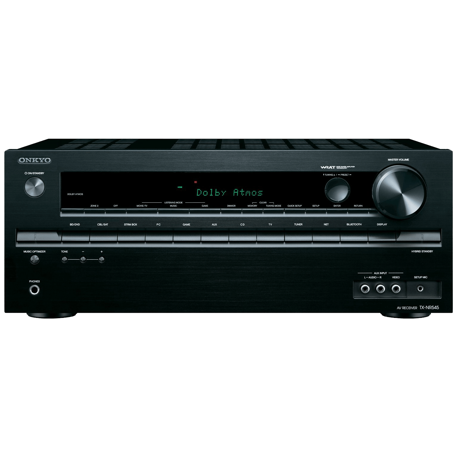 Specs ==== - Model: TX-NR545 Highlights: - Dolby Atmos Support - 115 W per Channel - Discrete Amp Circuits - HDMI 6 In / 1 Out - HDMI & HDCP 2.2 for 4K UltraHD - Built-in Bluetooth & Wi-Fi with Pandora, Spotify, and AirPlay - DSD 5.6 MHz, FLAC 192 kHz/24-bit Hi-Res Audio Capable - 384 kHz/32-bit Hi-Grade DAC - AccuEQ Room Acoustic Calibration Audio: Power output (All Channels): - 115 W/Ch (6 Ohms 1 kHz, 0.9% THD, 1 Ch Driven, FTC) - 65 W/Ch (8 Ohms, 20 Hz-20 kHZ, 0.7% 2 Ch, FTC) Dynamic Power: - 160 W (3 Ohms, Front) - 125 W (4 Ohms, Front) - 85 W (8 Ohms, Front) - THD+N: 0.08% (20 Hz20 kHz, Half Power) - Damping Factor: 60 (Front, 1 kHz, 8 Ohms) - Input Sensitivity and Impedance: 200 mV/47 k-ohms (Line) Rated RCA Output Level and Impedance: - 100 mV/2.2 k-ohms (Zone 2 Line Out) - 200 mV/470 ohms (Subwoofer Pre Out) Maximum RCA Output Level and Impedance: - 1.0 V/2.2 k-ohms (Zone 2 Line Out) - 2.0 V/470 ohms (Subwoofer Pre Out) - Frequency Response: 10 Hz100 kHz/+1 dB, -3 dB (Direct Mode) Tone Control: - 10 dB, 20 Hz (Bass) - 10 dB, 20 kHz (Treble) - Signal-to-Noise Ratio: 100 dB (Line, IHF-A) - Speaker Impedance: 6 ohms16 ohms - FM range: 87.5 MHz107.9 MHz - AM range: 530 kHz1,710 kHz - FM/AM Preset Memory: 40 stations Video: - Video: 1.0 Vpp/75 Ohms (Component Y) 0.7 Vpp/75 Ohms (Component PB/CB, PR/CR) 1.0 Vpp/75 Ohms (Composite) - Component Video Frequency Response: 5 Hz13.5 MHz/+0 dB, -3 dB Everything Else: - Power Supply: AC 120 V~, 60 Hz - Power Consumption: 4.3 A - No-Sound Power Consumption: 60 W - Standby Power Consumption: 0.1 W - Dimensions: 17 1/8" x 6 13/16" x 12 15/16" (W x H x D) - Weight: 19.0 lbs. - Basic manual - Basic and Advanced manual Condition: New Warranty: 2 year Onkyo Estimated Delivery:4/26 - 4/29Shipping: $5 or free with VMP What’s in the Box? ==== 1x Onkyo Receiver 1x Remote controller 1x AM loop antenna 1x Indoor FM antenna 1x Speaker setup microphone Pictures ==== 1/4 view Back Front Remote Price Comparison ==== $599 List, $389 at Amazon (26 reviews, fulfilled by Amazon)$429.99 at Amazon (sold by Amazon) Find a relevant price comparison? Please share it in a comment in this thread