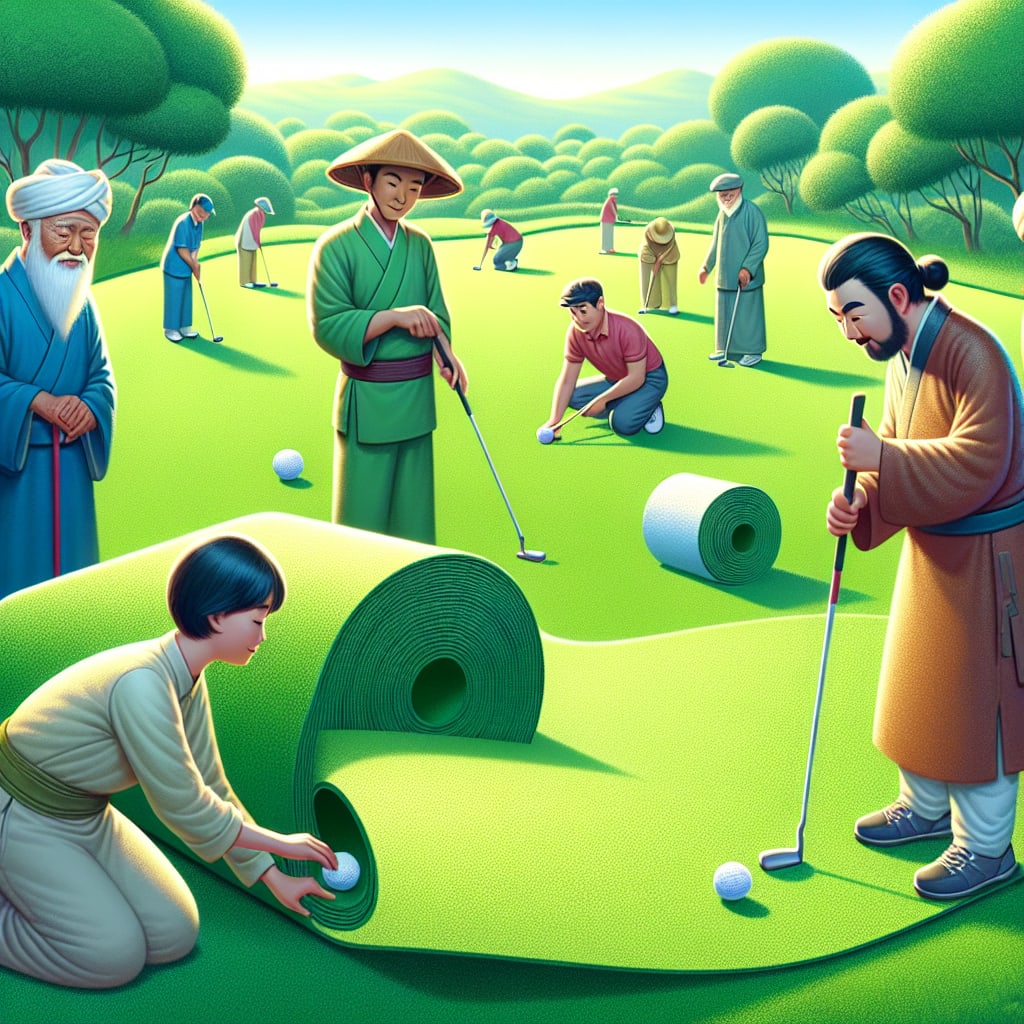 /showme a grassy mat that is being unrolled with golfers putting on it