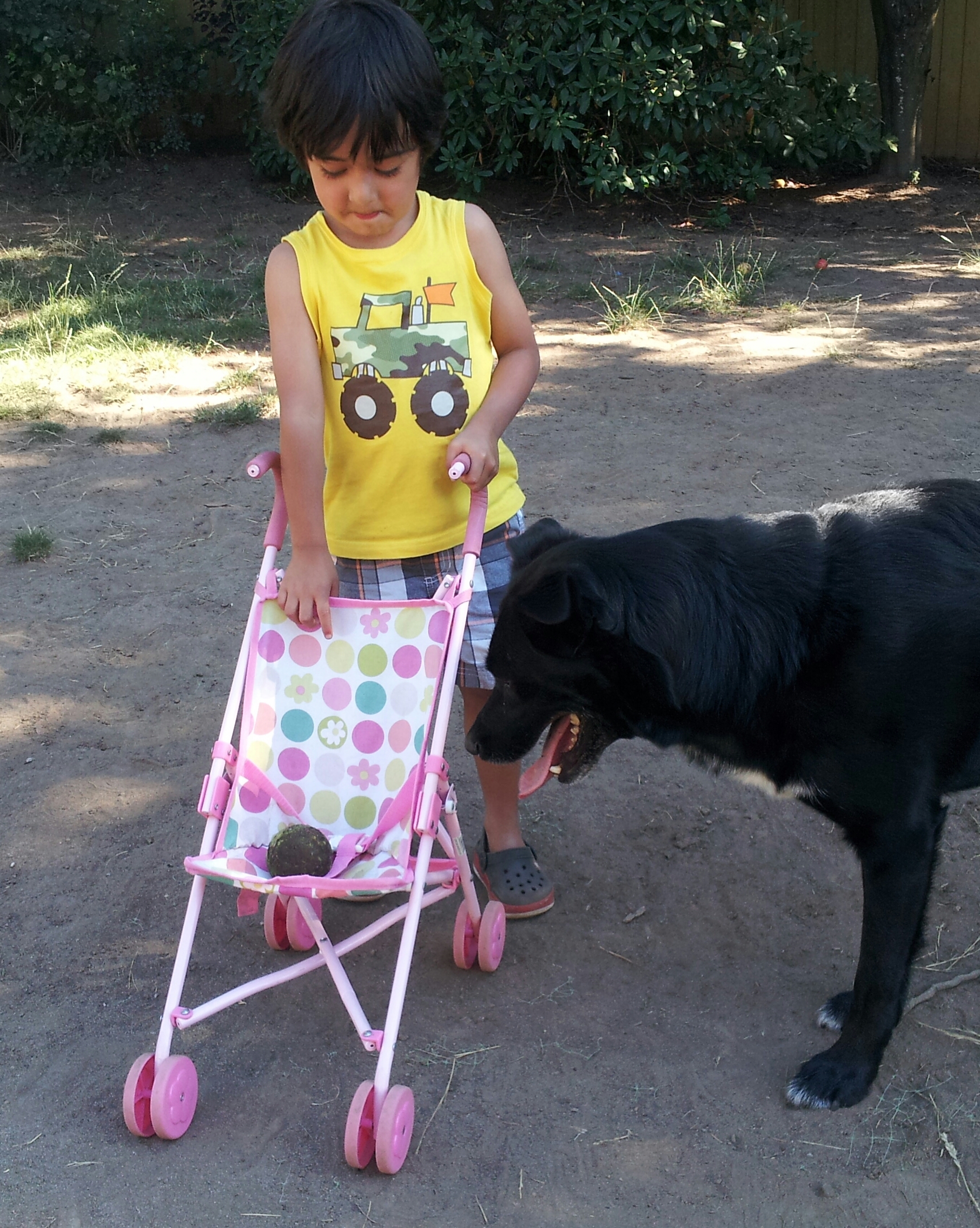 Torben snuggling with Roxy, our Boxer, who will be six in October.