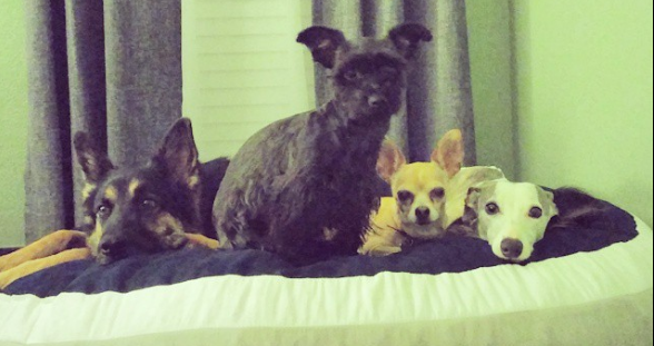 @mfladd the one standing is a mix schnauzer/poodle. the far right is a whippet. the chihuahua is the boss and the GSD is afraid of her. this is the only pic in 3 years that has all of their attentions, treat-baited or not.