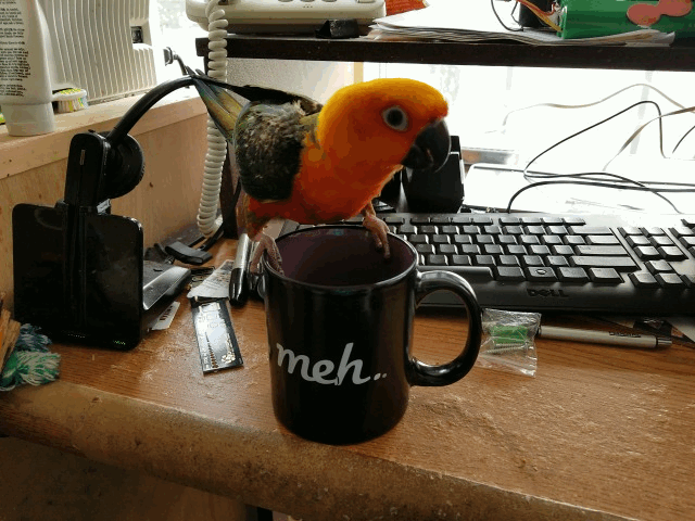 Here’s a cute animated GIF of my bird drinking out of my meh cup.